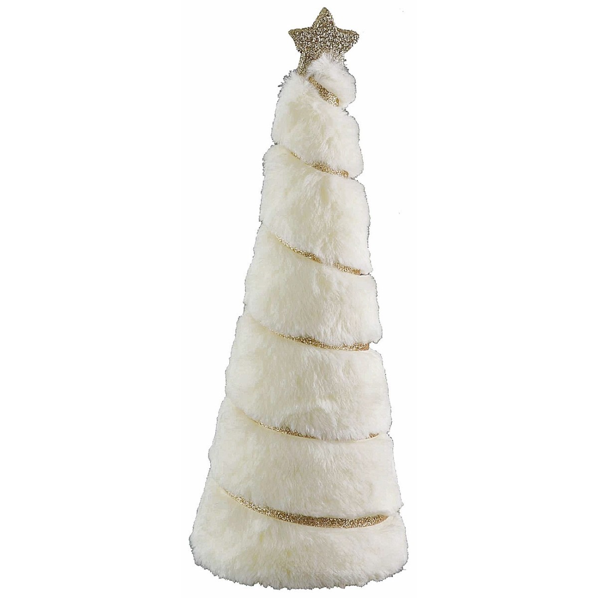 Alberello di pelliccia chiara con nastro e stella color oro, ideale per addobbare la casa in periodo natalizio. Come da immagine dimostrativa è possibile completare l'articolo con fili da 20 micro led a batterie disponibili nei prodotti correlati sotto la tabella.