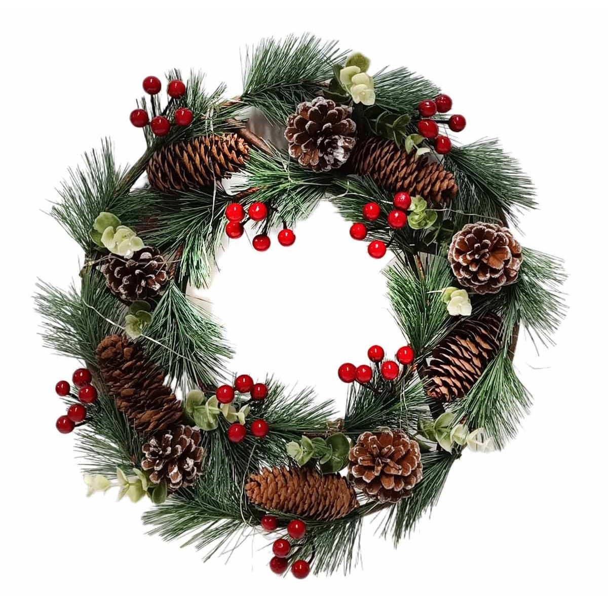 Dietro porta decorato con bacche e pigne, completo di luci a led, il diametro esterno misura 30 cm. L'articolo è funzionante a batterie (3xAA 1,5V non incluse) ed è ideale per creare un'atmosfera natalizia nelle vostre abitazioni.