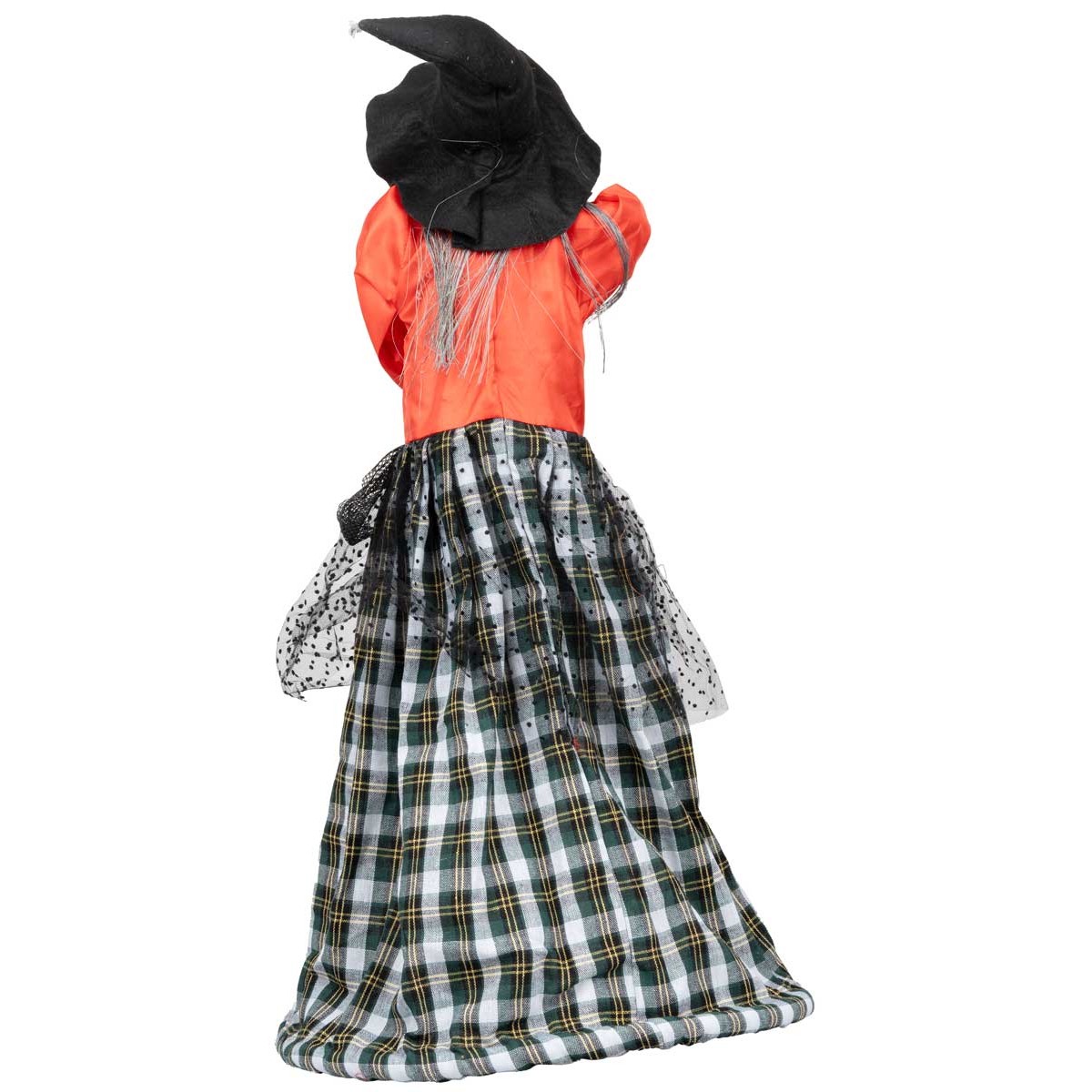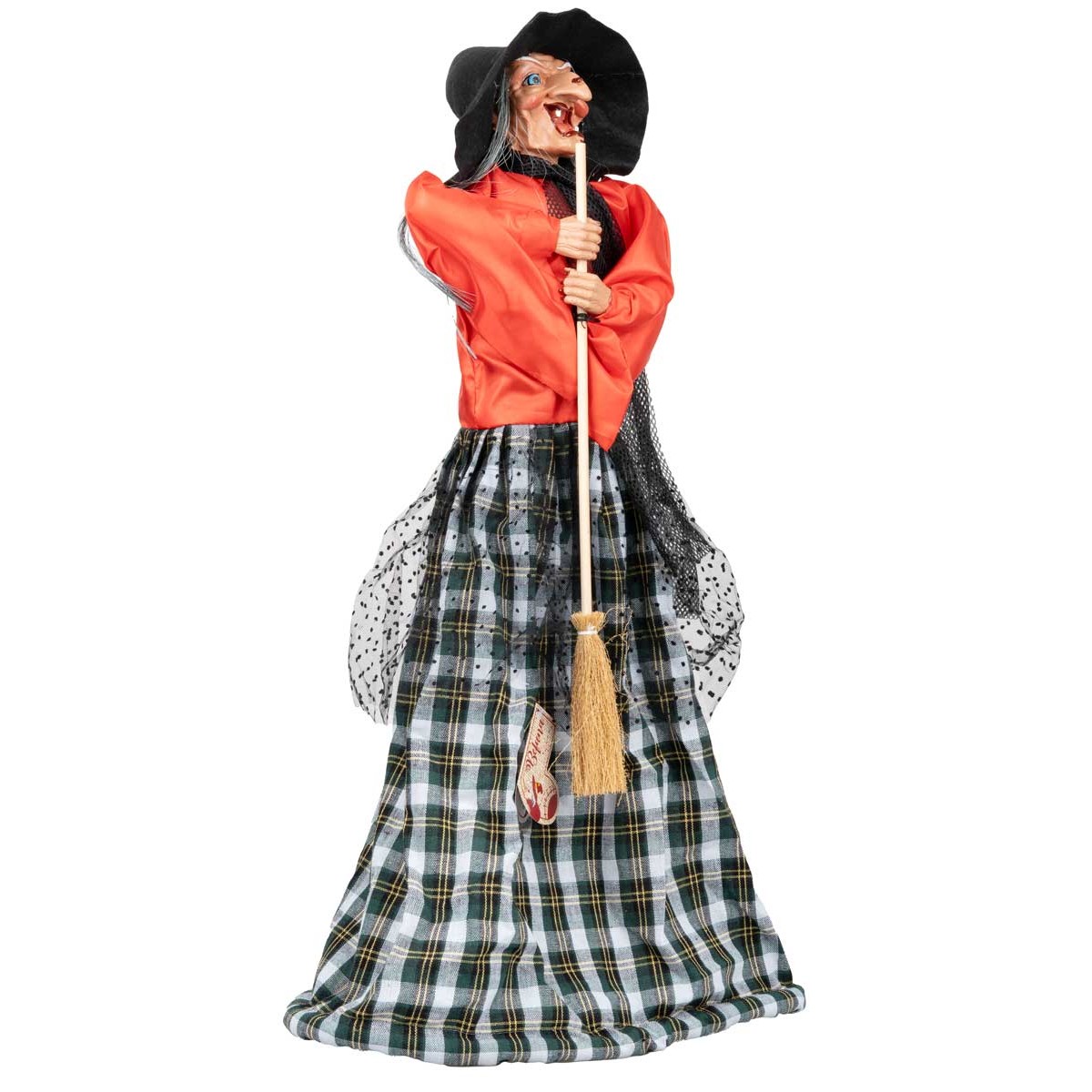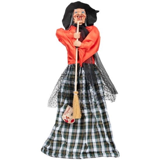 Befana in piedi vestita con un abito formato da una maglia a maniche lunghe rossa e una gonna a quadretti verdi e gialli, arricchita da uno strato di tessuto trasparente nero a pois. Questa figura include un cappello a punta nero con un velo assortito e tiene in mano una scopa in legno. Necessita del montaggio delle gambe in dotazione, bianche, per mantenere la stabilità in piedi. La Befana è dotata di effetti sonori e luminosi: un sensore permette il lampeggiamento degli occhi in rosso e l'emissione di una risata quando toccata. Funziona con batterie LR45, fornite e sostituibili.