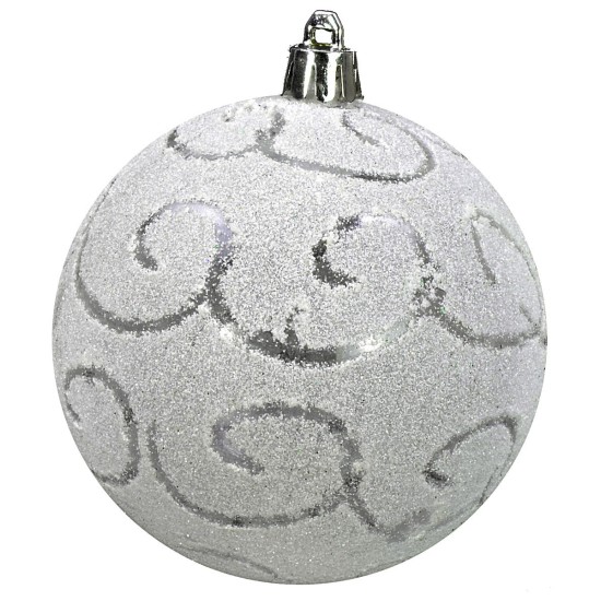 Pallina per albero di Natale 8 cm di color bianco glitterato con decoro.Nel nostro shop online sono disponibili palline dello stesso modello in altre misure.