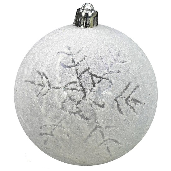 Pallina per albero di Natale 8 cm di color bianco glitterato con inciso un fiocco di neve.Nel nostro shop online sono disponibili palline dello stesso modello in altre misure.