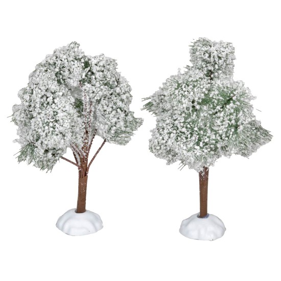 Set di due alberi innevati, altezza 14 cm ciascuno, ideali per accompagnare statuine di altezza tra 8 e 10 cm. Gli alberi presentano chioma e base finemente innevate, creando un'atmosfera invernale particolarmente adatta a paesaggi natalizi o decorazioni festive.