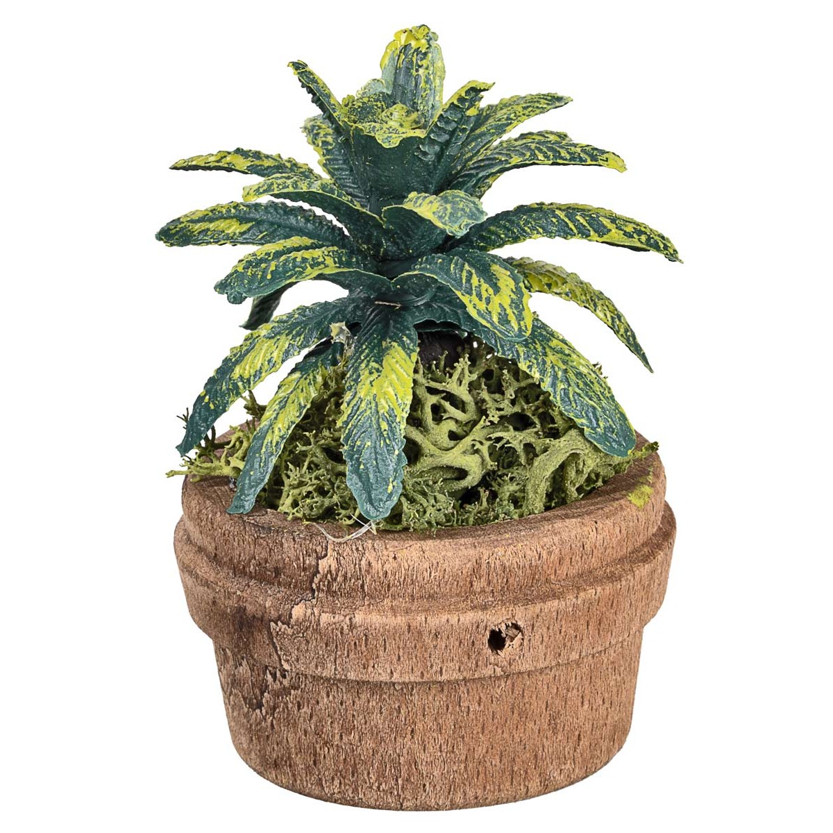 Pianta ornamentale in stile tropicale composta da foglie in PVC verde con sfumature gialle, inserita in un vaso tondo in legno con muschio decorativo alla base. L’altezza complessiva è di 6 cm, con diametro del vaso di 4 cm.