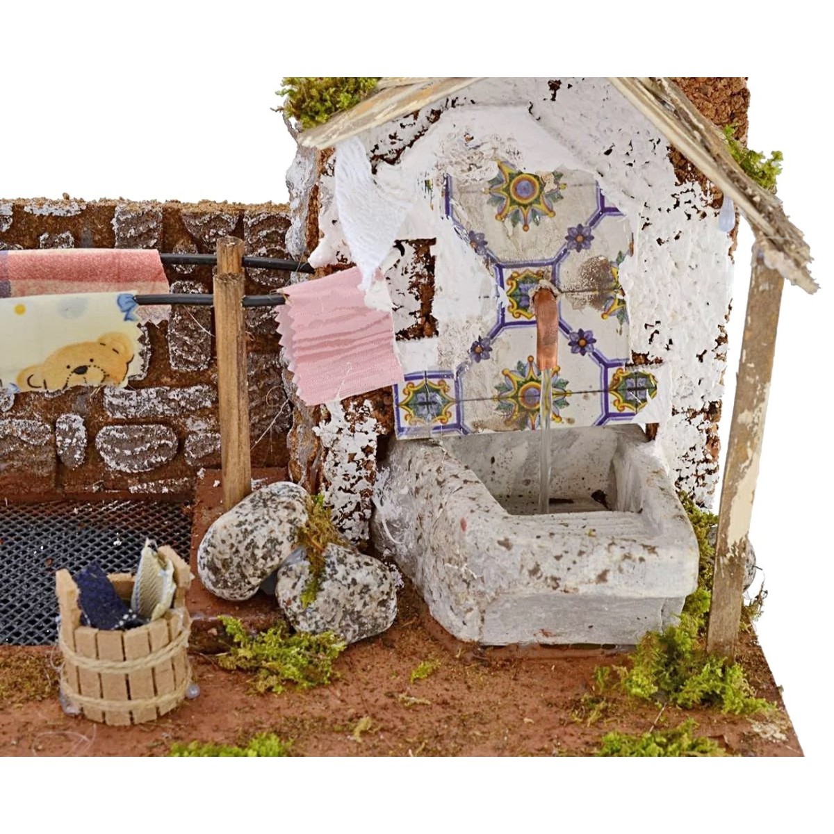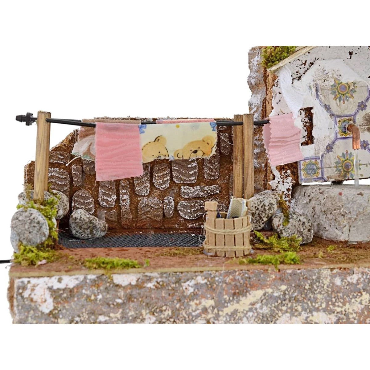Ambientazione per presepe con fontana lavatoio e stenditoio con panni bagnati che gocciolano, funzionante a corrente per statue di altezza 10 cm.
