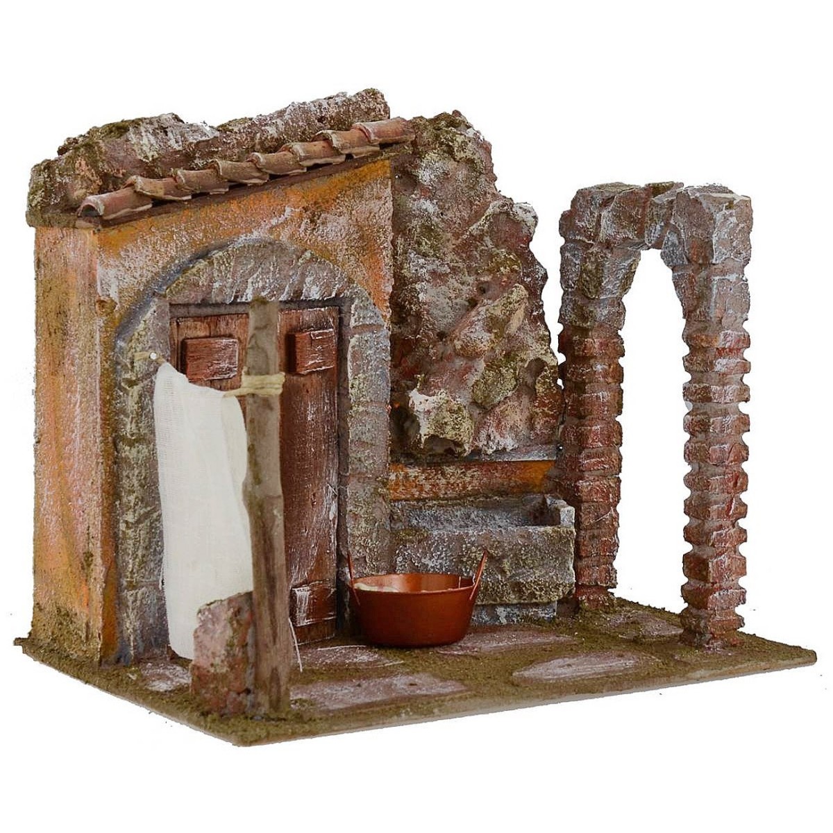Cortile per Presepe con grande lavatoio in pietra dove si lavavano i panni, a sinistra un'ampia porta in legno introduce nell'abitazione scavata nella roccia e un grande lenzuolo steso; a destra un vecchio arco a tutto sesto. Questa ambientazione è stata realizzata da sapienti artigiani italiani per il Presepe classico popolare in polistirene e legno; la struttura è adatta a statue di altezza 12 cm.