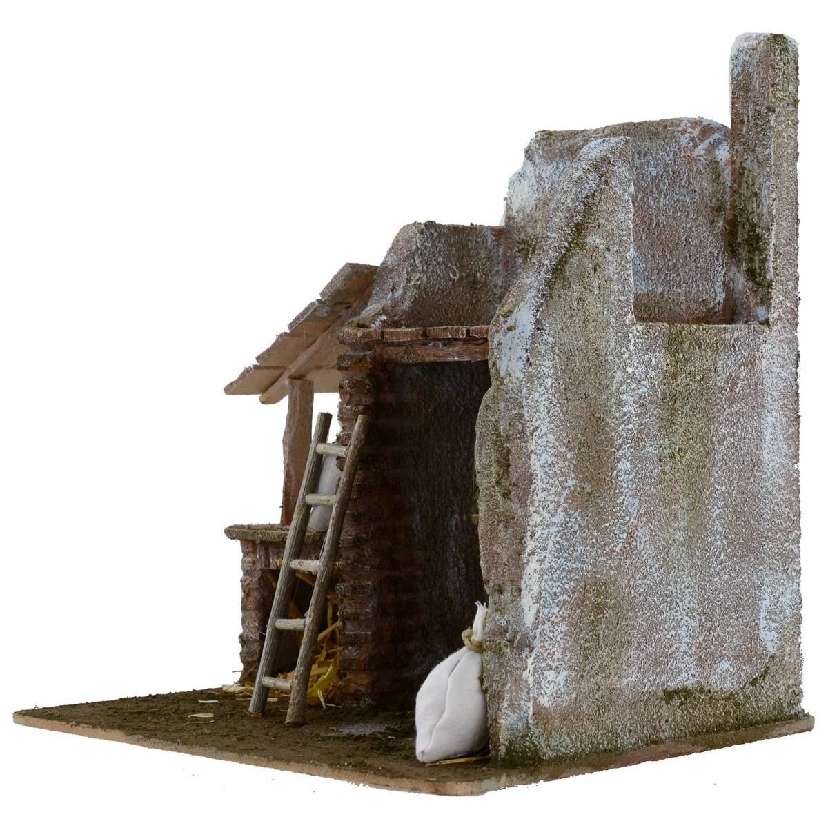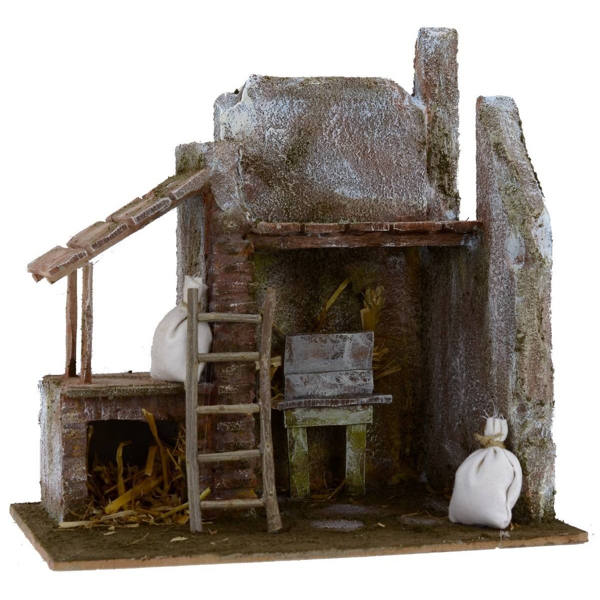 Ambientazione per il Presepe classico popolare composta da più strutture, il fienile è circondato da pareti di roccia e presenta un tetto piano, a sinistra un piccolo magazzino di paglia coperto da una pergola in legno. La scena è ben rifinita con sacchi bianchi, la scala e una particolarità all'interno del fienile dov'è riposta la sminuzzatrice per tagliare il fieno e la paglia. Questa ambientazione è stata realizzata da sapienti artigiani italiani per il Presepe classico popolare in polistirene e legno; la struttura è adatta a statue di altezza 12 cm.