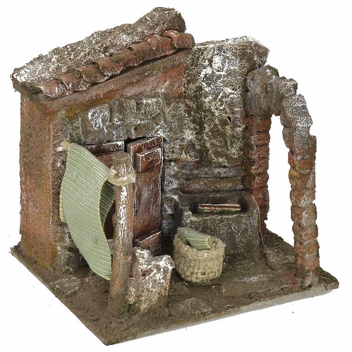 Cortile per Presepe con lavatoio in pietra dove veniva lavato il bucato. A sinistra troviamo un'ampia porta in legno che introduce nell'abitazione scavata nella roccia, vicino alla quale notiamo un grande lenzuolo steso; a destra, invece, un vecchio arco a tutto sesto. Questa ambientazione è stata realizzata da sapienti artigiani italiani per il Presepe classico popolare in polistirene e legno; la struttura è adatta a statue di altezza 6 cm.