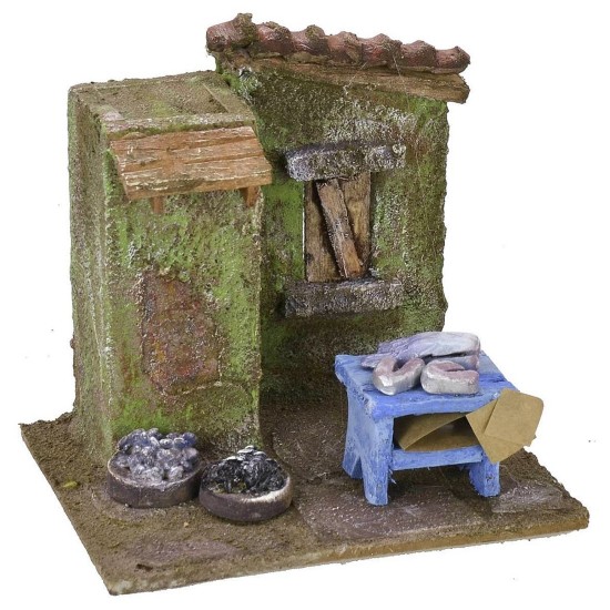 Bottega del pescivendolo ben rifinita: in primo piano, su un banco azzurro, vediamo della merce fresca, mentre sulla sinistra due cesti colmi di cozze e vongole riparati dalla tettoia dell'edificio; a destra notiamo, invece, una finestra con anta in legno chiusa sovrastata da un accenno di tetto in coppi. Questa ambientazione per presepe in stile classico Popolare è fatta artigianalmente in Italia in polistirene legno e sughero, ed è consigliata per statue di altezza 6 h cm, alcune delle quali proposte nei prodotti correlati.