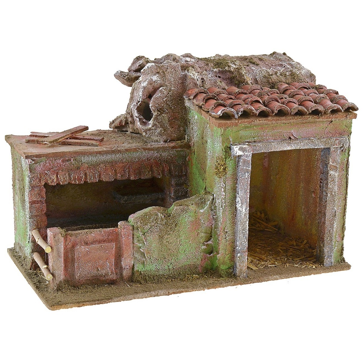 Doppia stalla per presepe. A sinistra la prima stalla con recinto per animali; a destra invece troviamo la seconda stalla con banchi dove è possibile collocale del fieno. Questa ambientazione è stata realizzata da sapienti artigiani italiani per il Presepe classico popolare in polistirene e legno; la struttura è adatta a statue di altezza 10 cm. come da immagini dimostrative.
