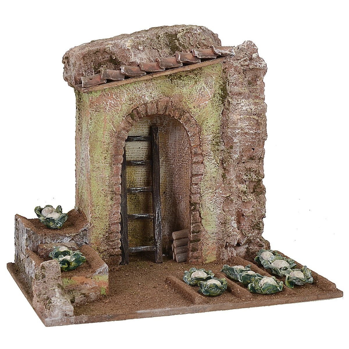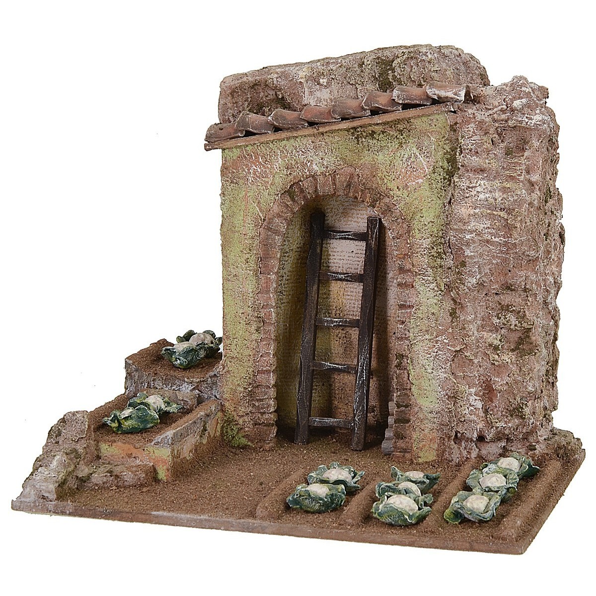 Campo ben curato e ordinato, caratterizzato da aiuole perpendicolari coltivate con cavolfiori.  Sul retro un ripostiglio dove sono riposti una scala e della legna. L'articolo è adatto a statue di altezza 12 cm ed è stato creato da sapienti mani artigiane italiane in polistirene e legno.