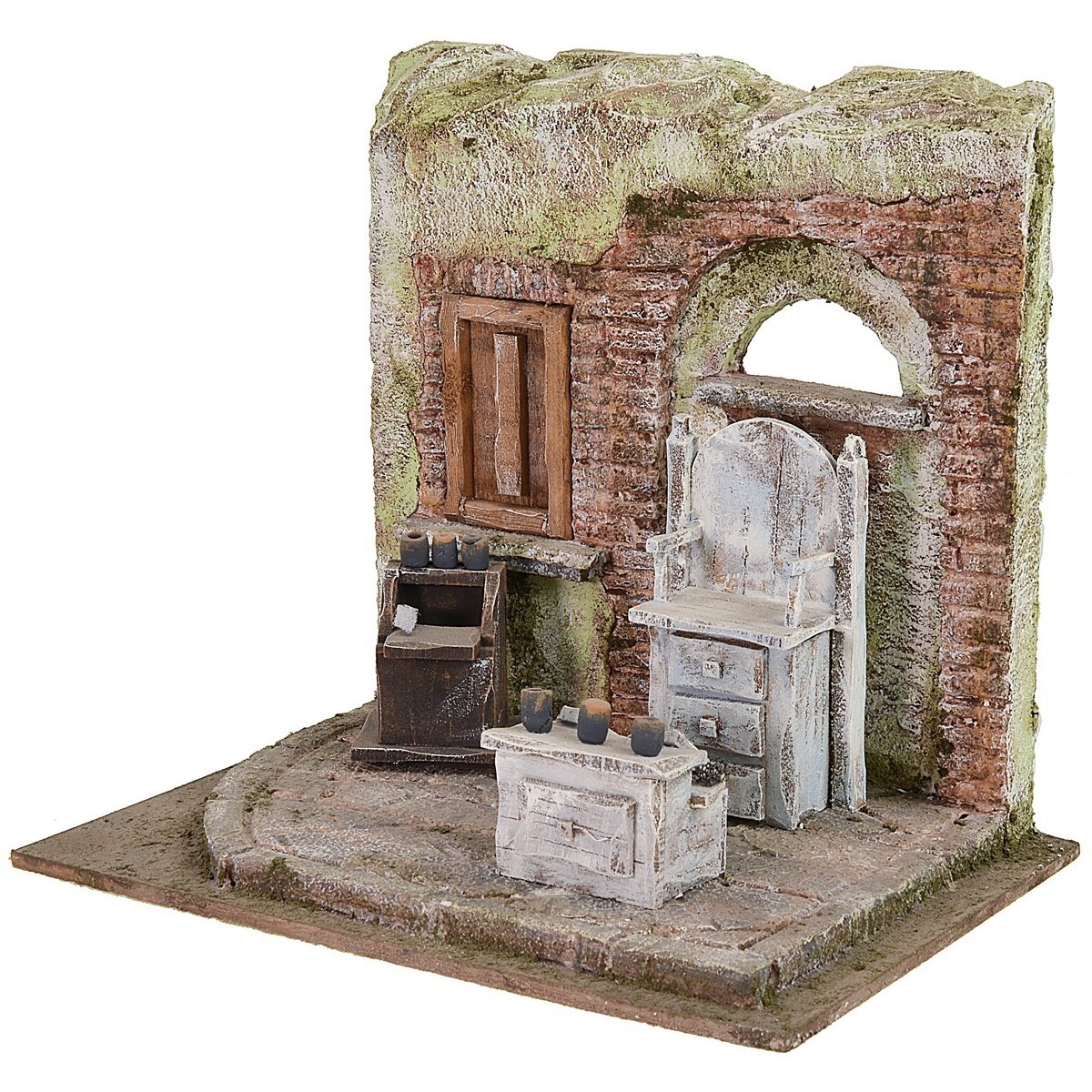 Ambientazione del lustrascarpe. Pezzo molto particolare per rendere unico il vostro Presepe, a destra è posizionata una poltrona in legno con un poggiapiedi dove il cliente si accomodava per la pulizia delle scarpe, a sinistra un porta oggetti dove sono riposti gli strumenti del mestiere. L'articolo è adatto a statue di altezza 12 cm ed è stato creato da sapienti mani artigiane italiane in polistirene e legno.