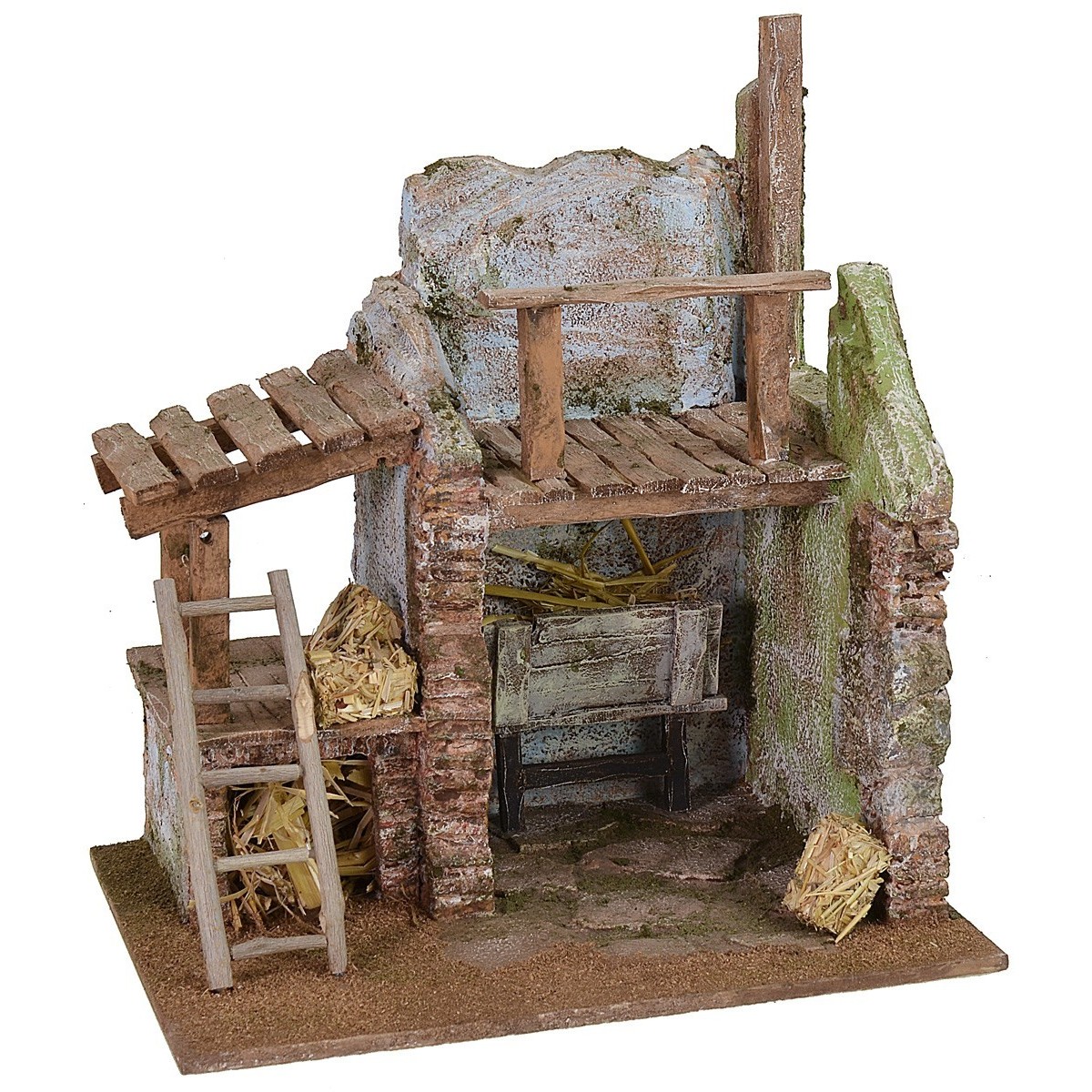 Fienile a due livelli con scala, a destra una mangiatoia per gli animali e al piano superiore un terrazzo aperto. Pezzo molto particolare per rendere unico il vostro Presepe, creato da sapienti mani artigiane italiane in polistirene e legno. L'articolo è adatto a statue di altezza 12 cm.