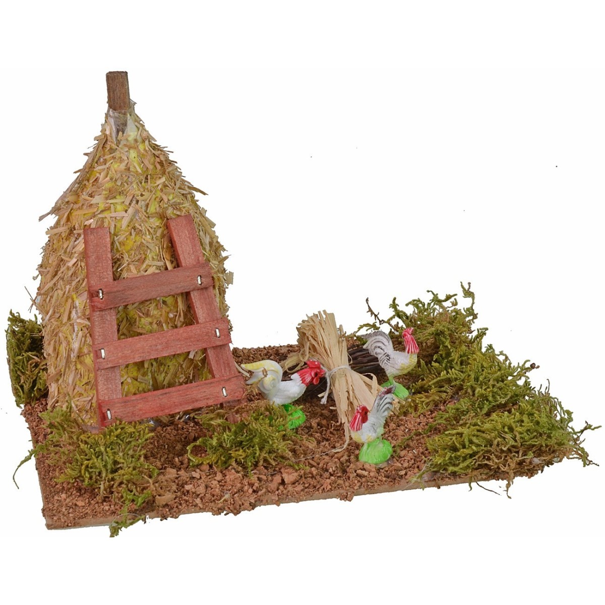 Covone di paglia con scala in legno, a fianco alcune galline che beccano libere sul prato verde. La scena è perfetta per arricchire gli ambienti del tuo presepe fai da te e può essere decorata con tante altre minuterie disponibili nella sezione del nostro sito. L'ambientazione è consigliata per statue di altezza 10-12 cm.