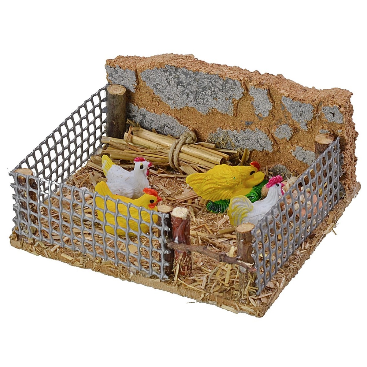 Recinto con quattro galline, la scena risulta ben rifinita e arricchita con una fascina di paglia, delle uova ed è circondata da una rete su tre lati, mentre sul retro un muretto in sughero decorato a pietra. L' ambientazione è perfetta per valorizzare il tuo Presepe fai da te ed è consigliata per statue di altezza cm 10.