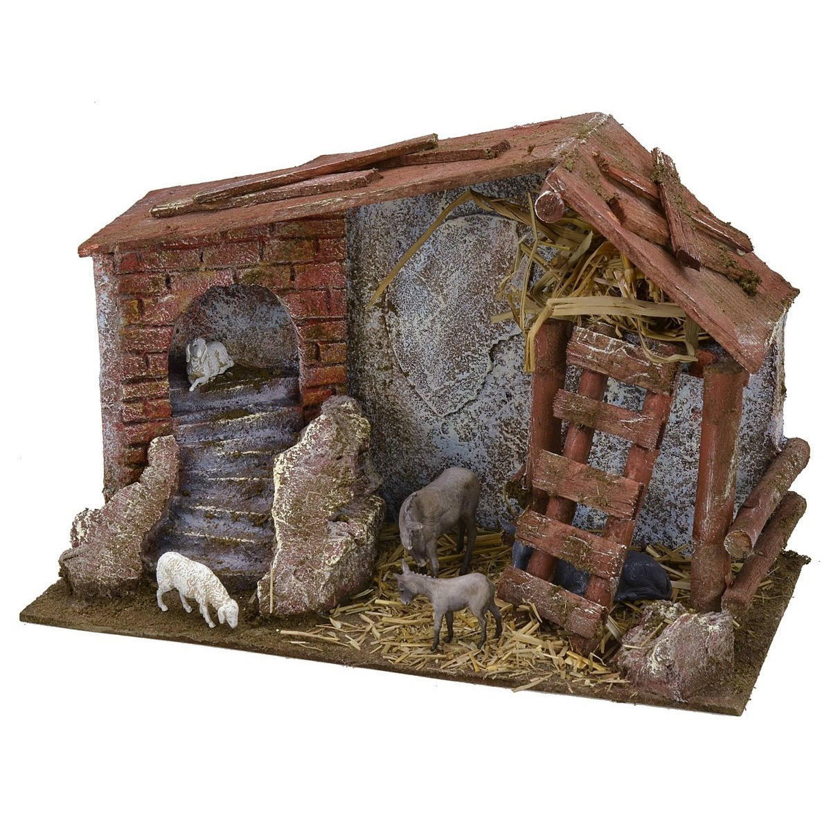 Stalla per animali composta da una scalinata sulla sinistra che conduce ad una piccola nicchia mentre a destra si trova una piccola recinzione con scala e fienile. L'ambientazione è consigliata per statue di altezza 8 cm ed è stata prodotta da artigiani italiani con legno e polistirene. La foto è puramente dimostrativa e l' articolo verrà consegnato senza animali, sono comunque acquistabili separatamente e sono presenti tra i prodotti correlati.