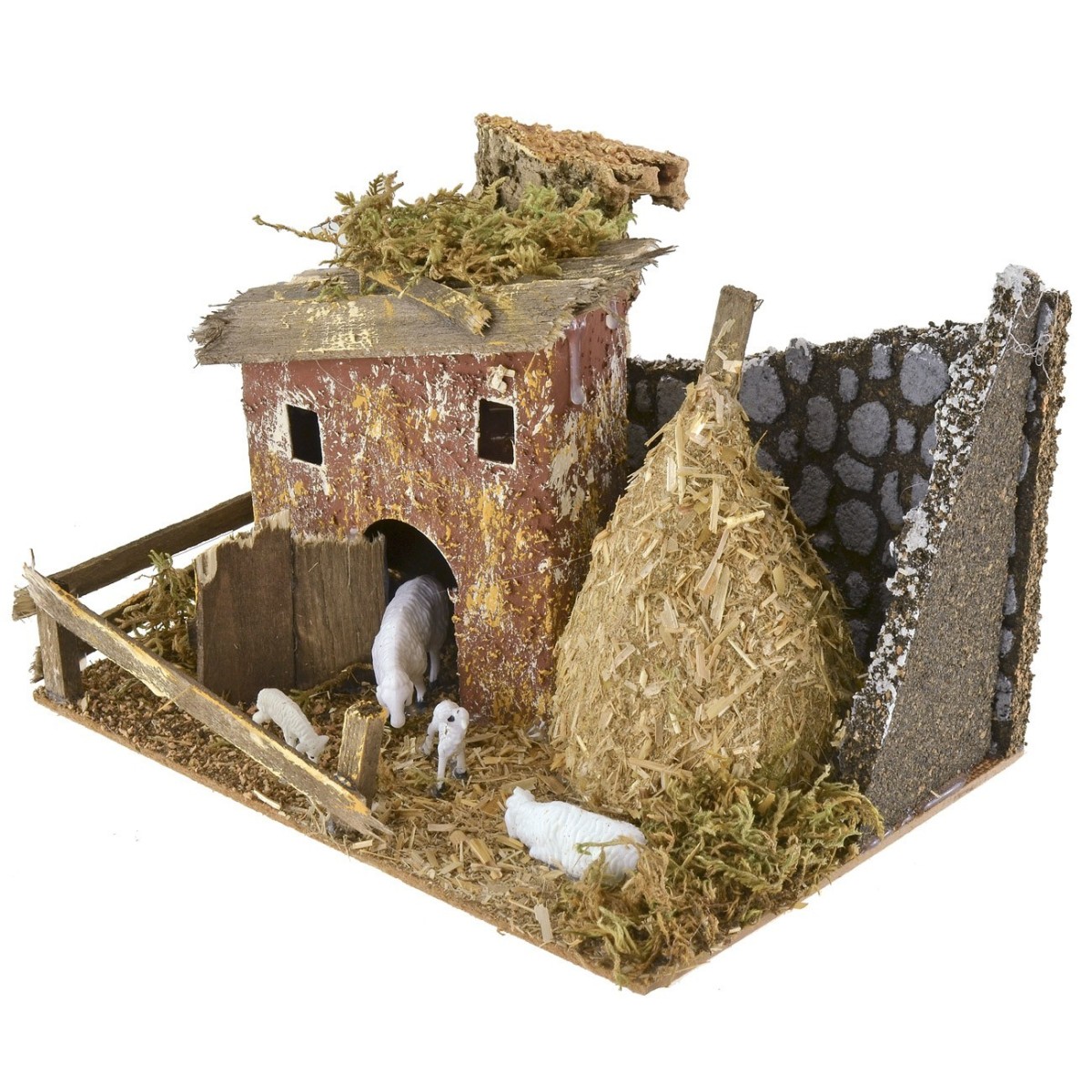 Recinto con pecore, a destra un alto covone di paglia, mentre a sinistra c'è la stalla delimitata da una staccionata in legno. L' ambientazione è rifinita in ultimo piano da una parete di pietre e rocce. Questa scena è consigliata per statuine di 8-10 cm ed è stata realizzata con legno e sughero.