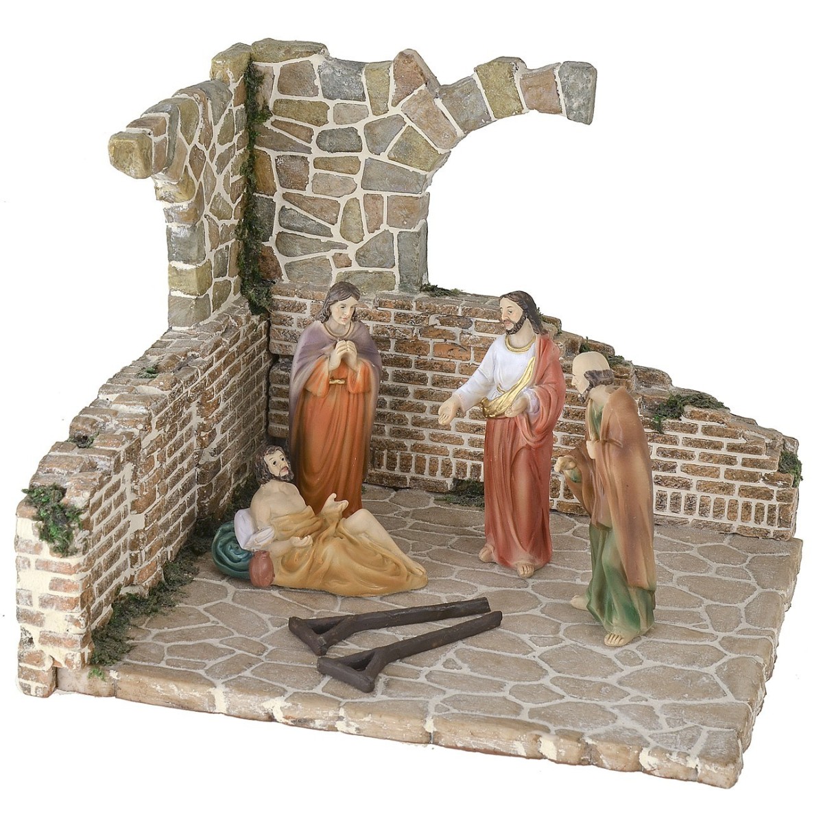 Scenografia per presepe in resina caratterizzata da pietre e mattoncini con fughe, le due pareti ad angolo riproducono dei ruderi di arco. Quest' ambientazione è perfetta per ricreare sia delle scene pasquali del Diorama, sia quelle del presepe come nelle foto puramente dimostrative. L'articolo è stato prodotto artigianalmente in Italia ed consigliato per statuine di altezza da 8 a 10 cm. Nei prodotti correlati sotto la tabella sono disponibili i codici per le figure presenti nelle immagini.