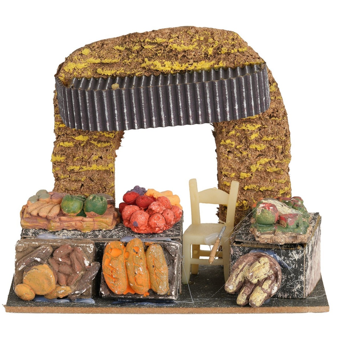 Ambientazione fruttivendolo con arco e tettoia. Nella scena sono presenti bancarelle di ortaggi e frutta fresca. Il prodotto è realizzato in resina. Si consiglia l'utilizzo con statue di altezza 8-10 cm, (per ulteriori specifiche andare nella sezione dettagli del prodotto). Si precisa che alcuni particolari delle minuterie (frutta e verdura) potrebbero variare rispetto alle foto.