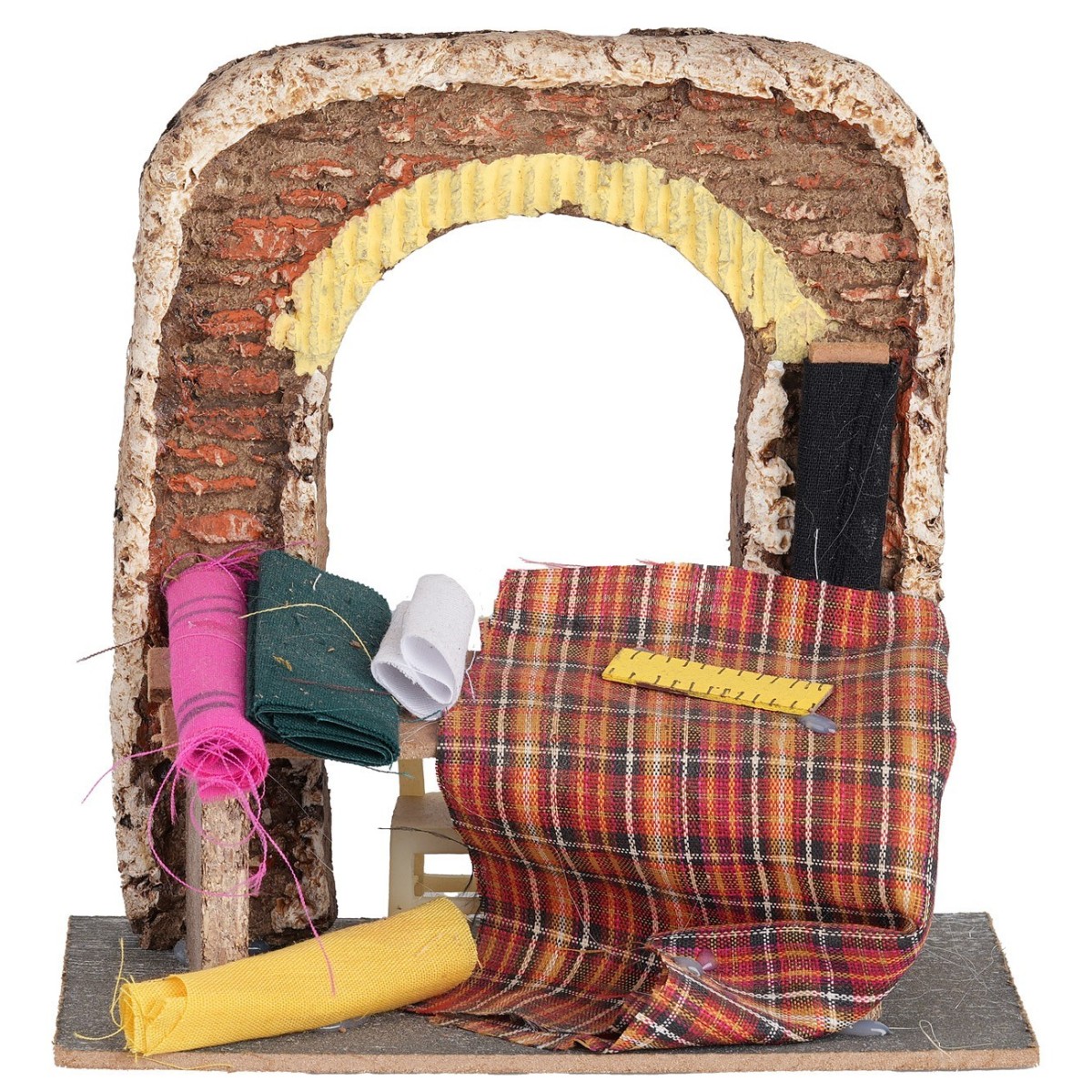 Bottega del tappezziere con arco. Questa scena rappresenta una bottega con una bancarella colma di stoffe. Il prodotto è realizzato in resina, ed è consigliato per  statue di altezza 10 cm. Essendo un prodotto artigianale, alcuni dettagli delle minuterie possono variare rispetto alle foto.