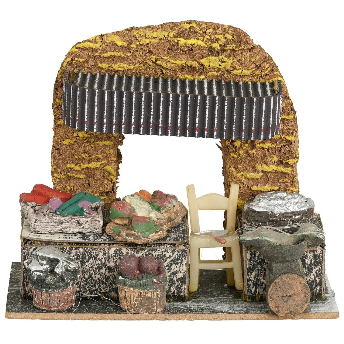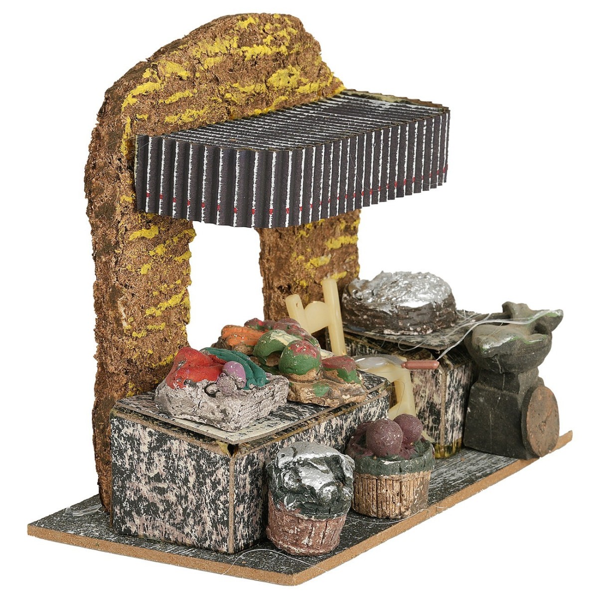 Ambientazione mercato con arco e tettoia. Nella scena sono presenti bancarelle di pesce, ortaggi e frutta fresca. Il prodotto è realizzato in resina. Si consiglia l'utilizzo con statue di altezza 8-10 cm, (per ulteriori specifiche andare nella sezione dettagli del prodotto). Si precisa che essendo un prodotto artigianale alcuni particolari delle minuterie potrebbero variare rispetto alle foto.