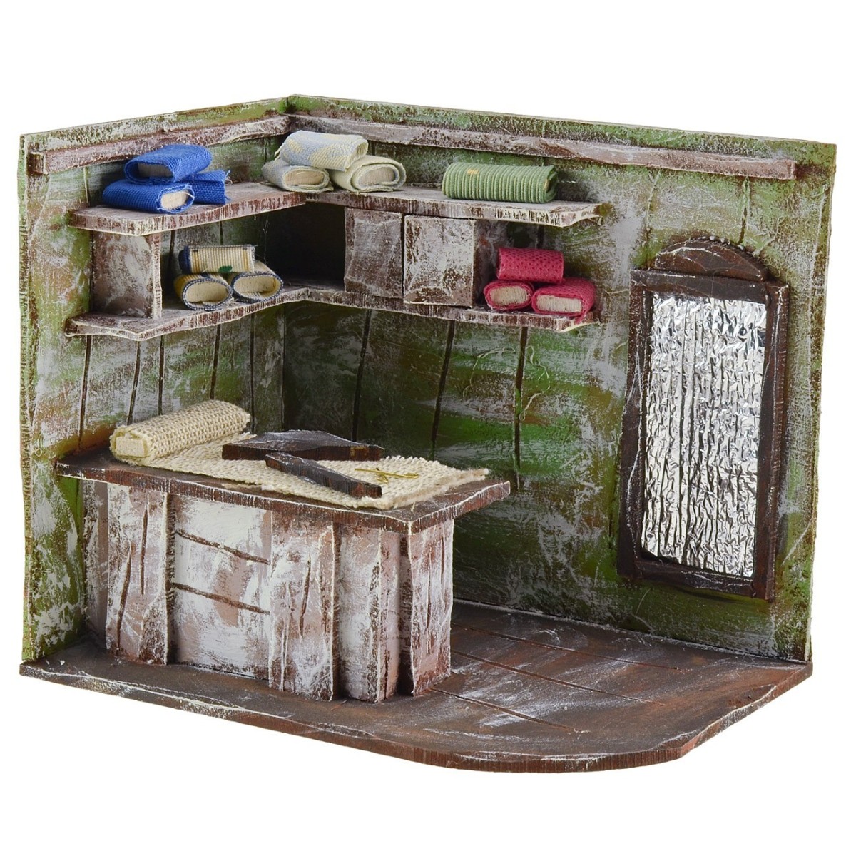 La sartoria è riconoscibile dalle mensole su cui sono riposte le varie stoffe di diversi colori, uno specchio per la clientela che visita il negozio e un bancone su cui il sarto può lavorare. Questa scenografia rustica non comprende la statuina del sarto presente nelle fotografie illustrative, però è possibile acquistarla separatamente nei prodotti correlati qui sotto. L'articolo è stato realizzato in legno da artigiani italiani. Si consiglia l'utilizzo con figure della serie 12 cm, come in fotografia.