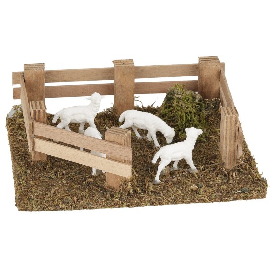 Steccato in legno che racchiude le 4 pecorelle, che stanno mangiando. Si consiglia l'utilizzo per la creazione di rifiniture e dettagli nel presepe. Realizzato a mano da artigiani italiani, in prodotto con legno, sughero e muschio. Si consiglia l'utilizzo con statue di altezza 8-10 cm. Il prodotto risulta perfetto per arricchire e rendere originale il presepe.