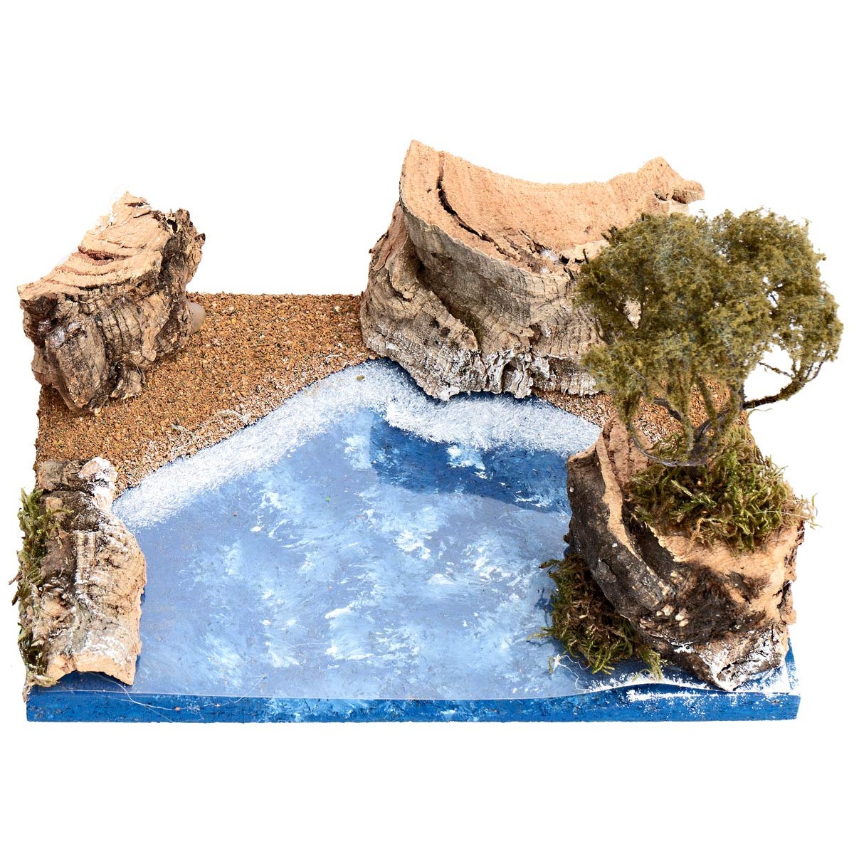 La scena riproduce un tratto di mare con effetto profondità, arricchito da una spiaggia in sabbia e un isolotto con albero e muschio. La composizione è completata da scogli e dettagli in sughero naturale che rendono l’insieme più realistico.