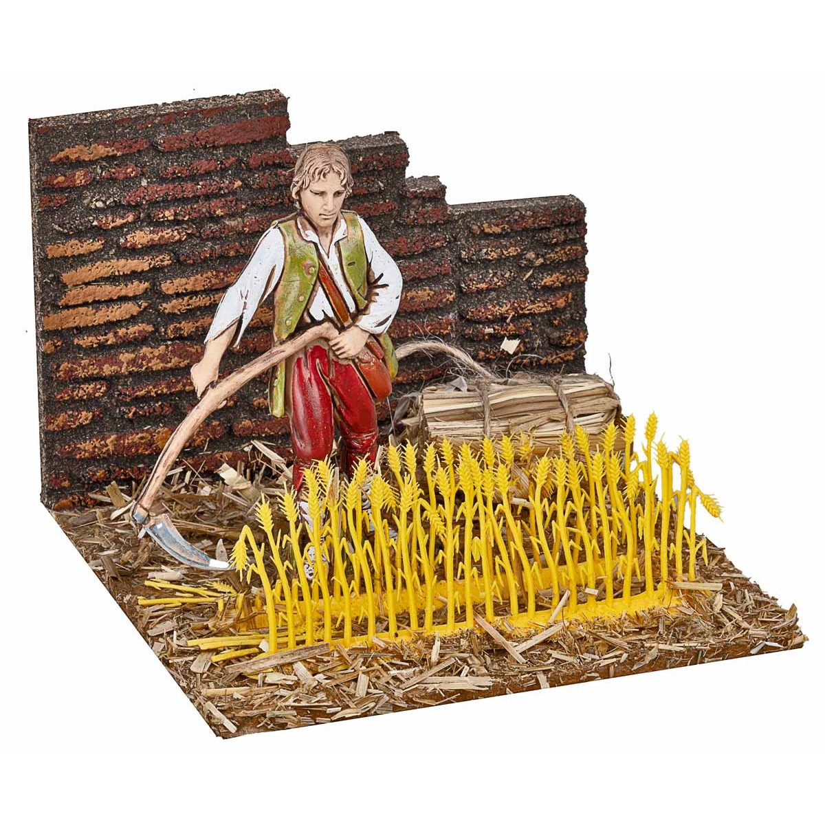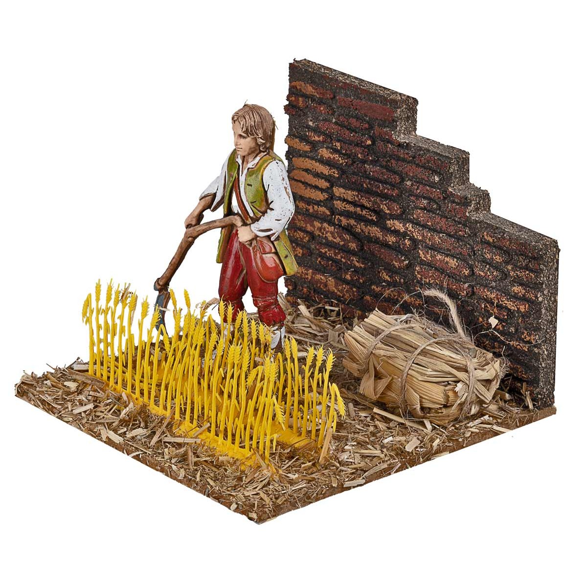 Ambientazione di campagna con statua della serie Landi alta 10 cm che miete il grano. L'articolo è realizzato artigianalmente in Italia, utilizzando legno, sughero e muschio per un effetto autentico, perfetto per arricchire il presepe con una scena rurale tradizionale.si precisa che la statua serie Landi 10 cm ha un'altezza reale di 9 cm.