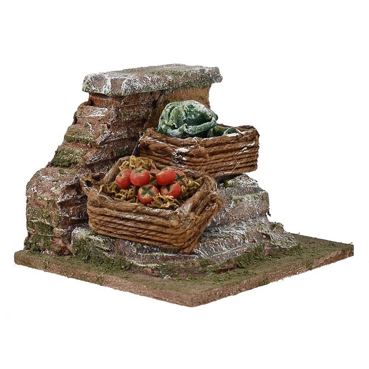 Ambientazione per presepe in stile classico Popolare con cesti di verdura in primo piano poggiati su un blocco di roccia e come sfondo un rudere di muro. Articolo artigianale ben rifinito prodotto in polistirene, legno e terracotta, dipinto a mano e consigliato per statue di altezza 8-10 cm.