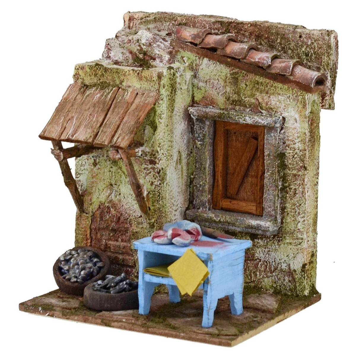Bottega del pescivendolo con in primo piano un banco azzurro dov'è riposta la merce fresca, a sinistra due cesti colmi di cozze e vongole riparati dalla tettoia dell'edificio; a destra una finestra con anta in legno chiusa sovrastata da un accenno di tetto in coppi. Questa ambientazione per presepe in stile classico Popolare è fatta artigianalmente in Italia in polistirene legno e sughero, ed è consigliata per statue di altezza 8-10 cm.