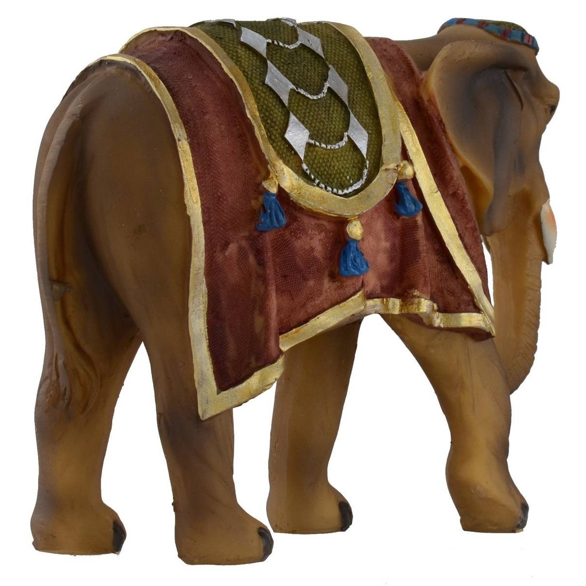 Elefante addobbato in resina, consigliato per statue di altezza 8-10 cm. Il prodotto è realizzato interamente in resina ed è ideale per presepi e diorami.