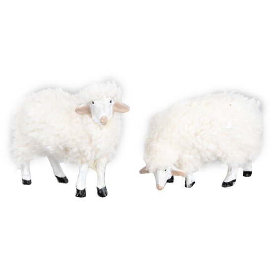 Il set comprende una pecora con la testa alzata e una pecora con la testa chinata, entrambe realizzate in resina e rivestite in lana per un effetto realistico.