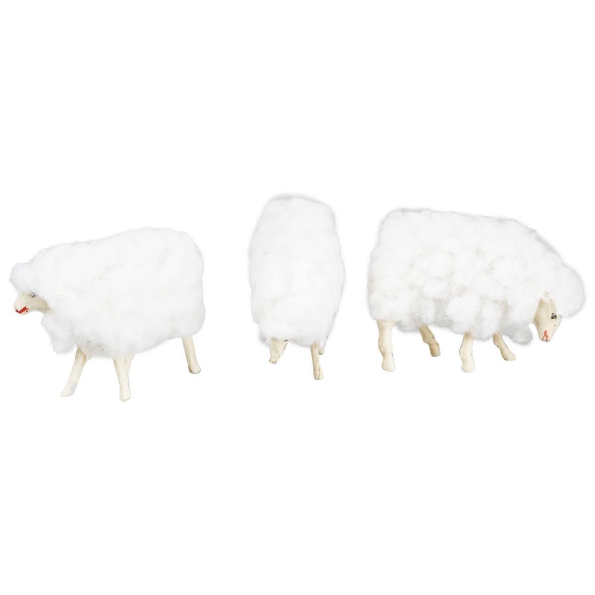 Set di tre pecore bianche in PVC con rivestimento in pelo sintetico, consigliato per statuine di altezza 8-10 cm. Sono ideali per arricchire greggi, scene pastorali e ambientazioni campestri del presepe.