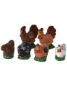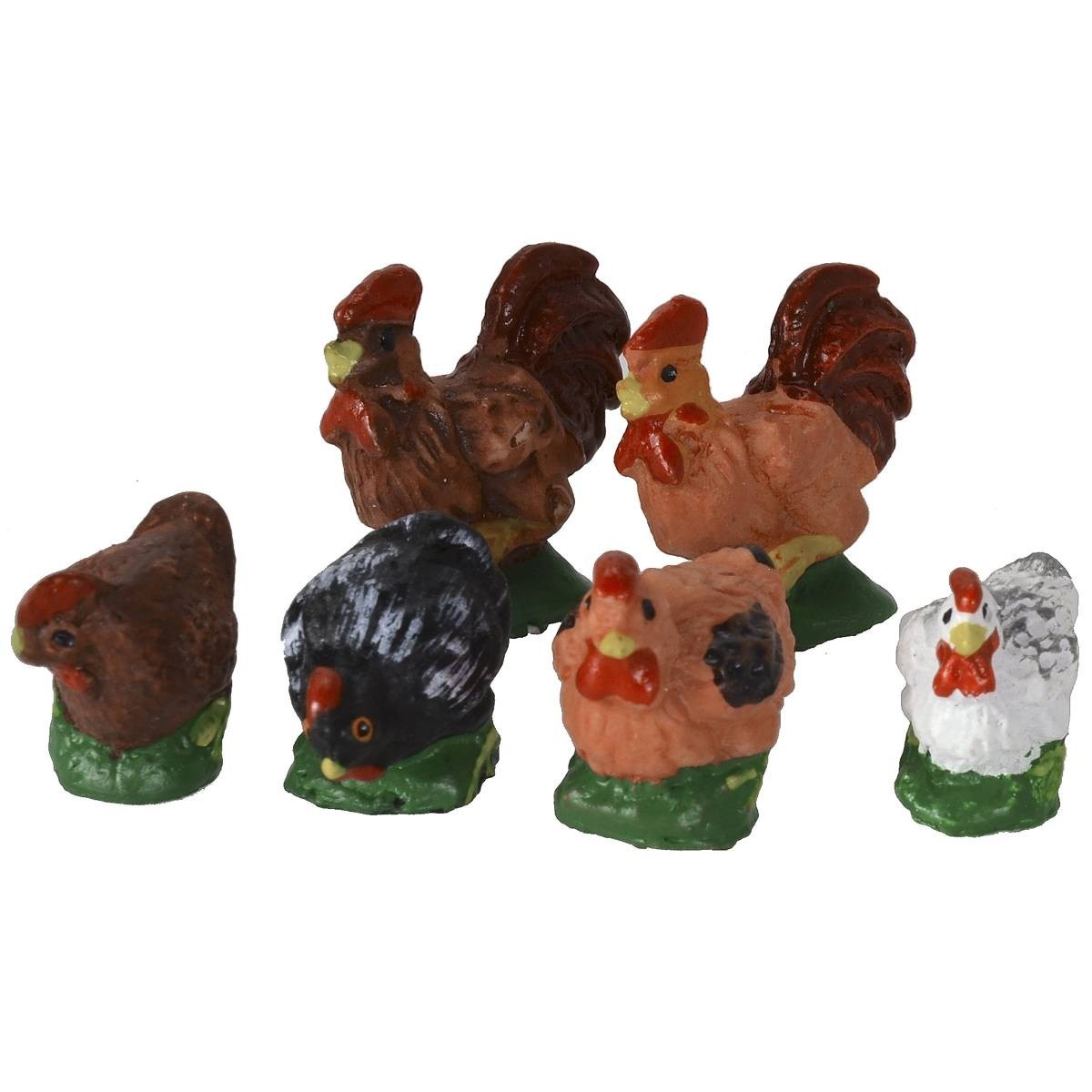 Set 6 galline in resina con colori assortiti, consigliate per statue di altezza 8-10 cm.