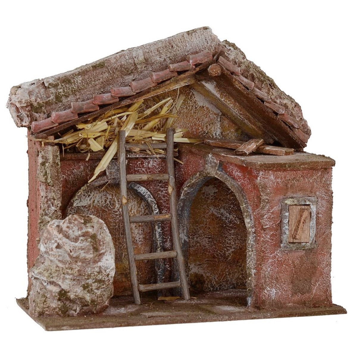 Capanna con due archi e una scala per raggiungere il fienile, scenografia ben rifinita: essa è caratterizzata da una capanna delineata da un tetto triangolare rifinito di coppi in terracotta. All'interno, sulla destra, è presente uno spazio con un ingresso ad arco.; mentre al centro, vi è una scala in legno che conduce fino al fienile colmo di paglia soprastante. La capanna è realizzata interamente in Italia da sapienti mani artigiane utilizzando il polistirene, legno e sughero. Si consiglia di abbinare alla seguente capanna statue di Natività di altezza 10 cm, disponibili nei prodotti correlati di seguito.