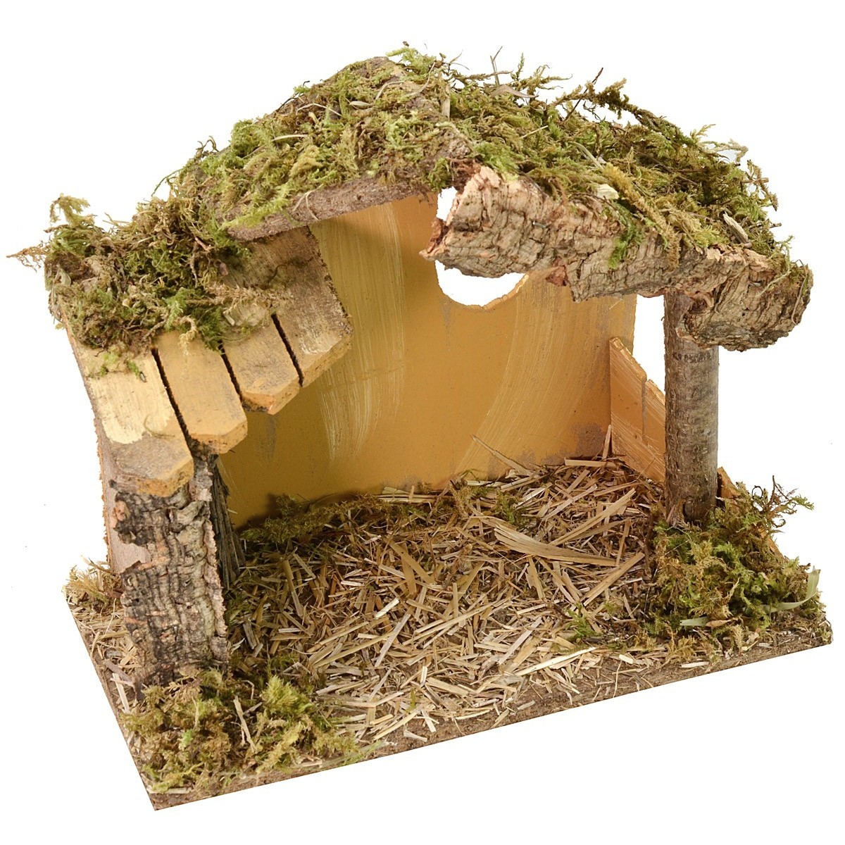 Capanna con una finestra che illumina la scena; il tetto della capanna è ricoperto di muschio che è presente anche in altre parti dell'ambientazione mentre il pavimento è coperto di paglia. Sono consigliate statuine dall'altezza 8 cm presenti nei prodotti correlati che trovate sotto la tabella e nella categoria del sito 'statue presepe' ed è possibile illuminare l'ambientazione con apposite luci presenti nella categoria 'illuminazione presepe' del sito. L'articolo è stato prodotto artigianalmente in legno sughero e muschio.