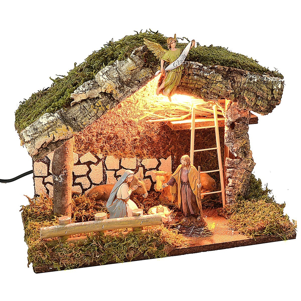 La capanna sarà spedita con la stessa quantità di soggetti mostrati in foto: Gesù Bambino, Maria, San Giuseppe, bue, asinello e angelo, tutte appartenenti alla collezione Landi Moranduzzo. Si precisa che la sopracitata serie misura realmente circa 8,5-9 cm di altezza.