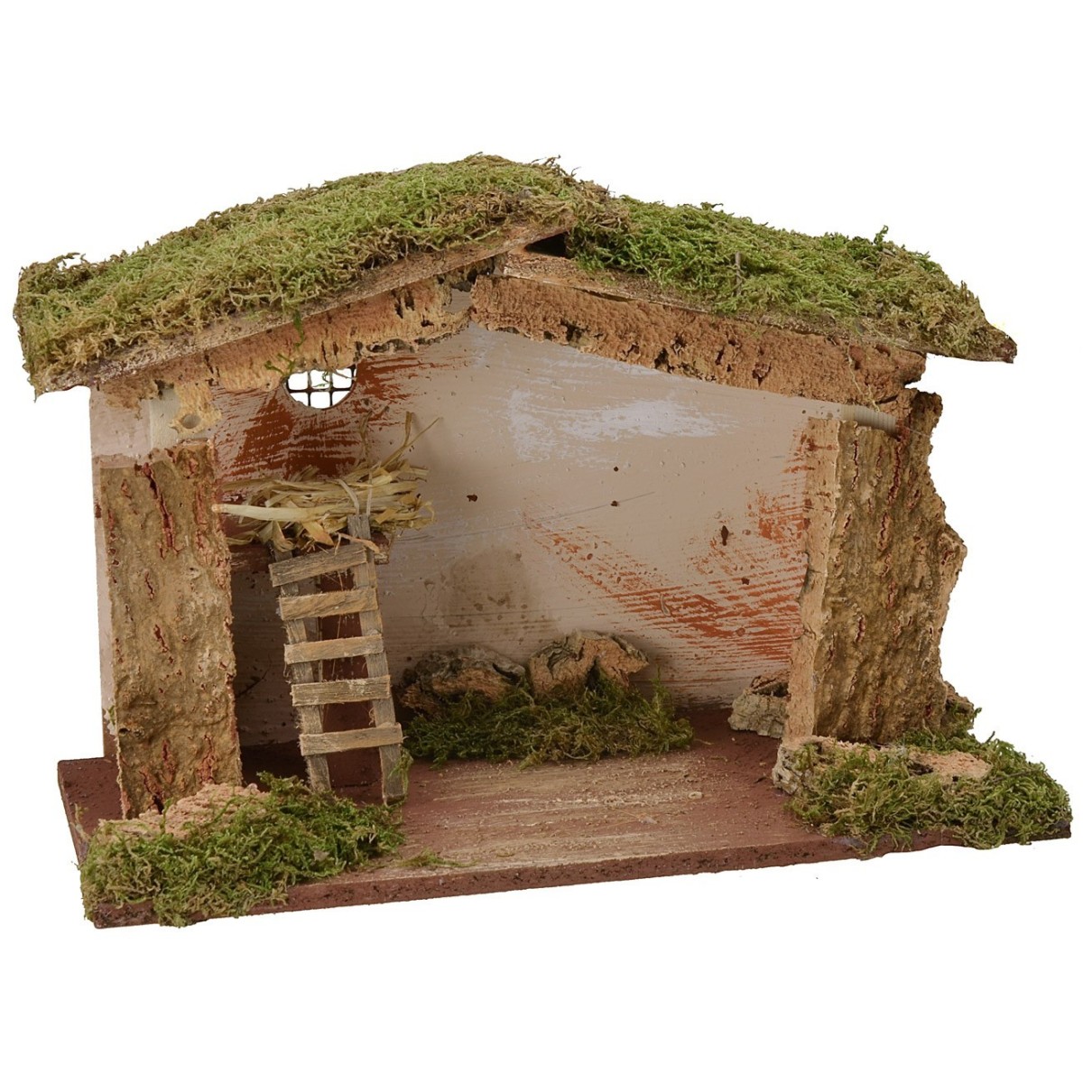 Capanna di sughero e muschio rifinita con diversi dettagli come la scala che conduce al piano superiore dov'è presente della paglia e una piccola finestra circolare. L'ambiente può essere decorato inserendo la Natività per cui si consigliano statue di altezza 14-15 cm e renderlo più suggestivo aggiungendo, per esempio, una luce che illumini la scena. Nei prodotti correlati potete trovare alcune natività compatibili e la luce per illuminare la capanna.