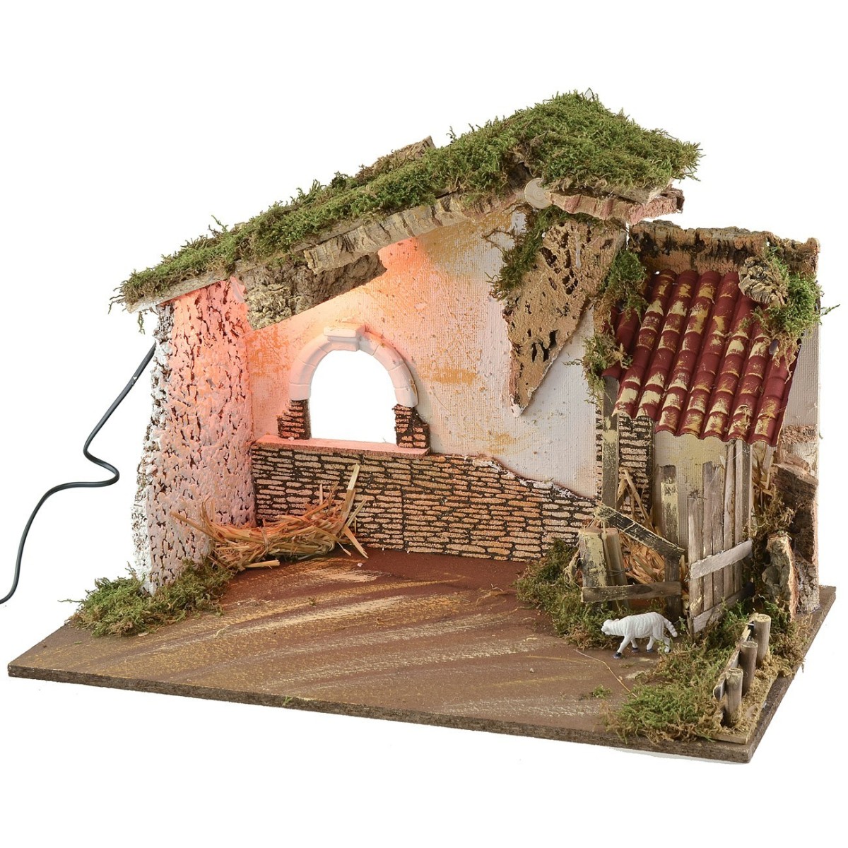 Capanna con finestra ad arco e mangiatoia, illuminata con lampada funzionante a corrente, consigliata per natività di altezza da 20 a 24 cm. La capanna per presepe è realizzata in legno e sughero e muschio.