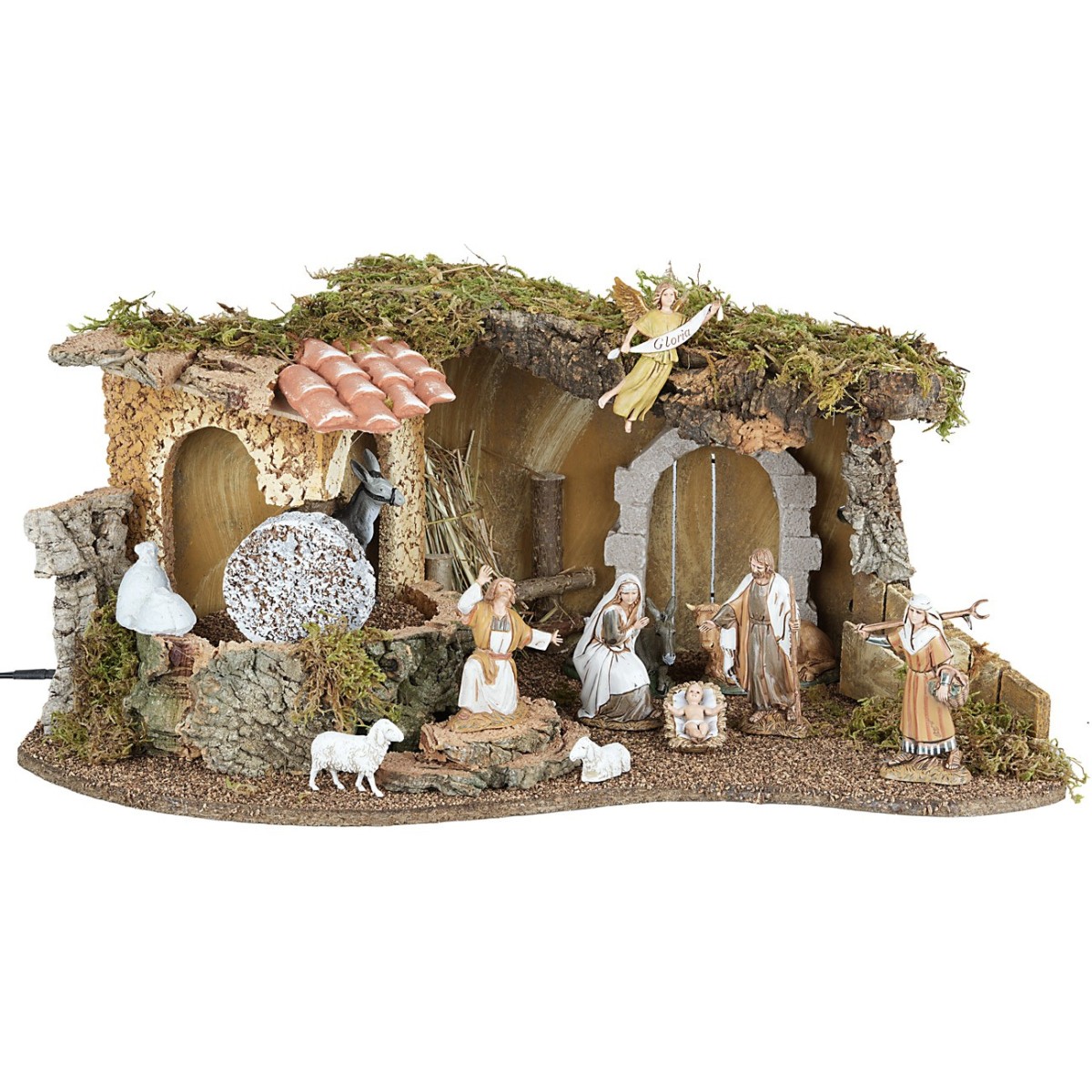 Capanna completa di statuine, con illuminazione e macina funzionanti a corrente.