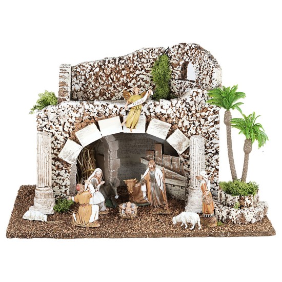 Capanna in stile arabo caratterizzata da mura bianche in stile palestinese con rifiniture marroni e un ampio arco. L'entrata è adornata da delle colonne di marmo usurate dal tempo su entrambi i lati. L'articolo sarà sempre fornito con la stessa quantità di personaggi Landi Moranduzzo serie 10 cm presenti in foto con altezza reale di circa 9 cm, si precisa che i soggetti potrebbero cambiare a seconda delle disponibilità. l'articolo è prodotto artigianalmente in Italia con legno sughero e muschio.