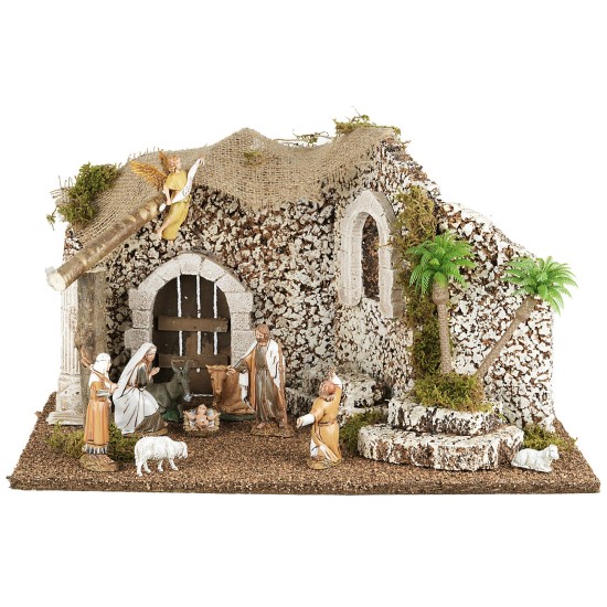 Capanna in stile arabo con ampio spazio in cui è collocata la Natività appartenente alla serie costumi storici Landi Moranduzzo 10 cm, anche se la loro effettiva altezza è inferiore al nome della serie e corrisponde a 9 cm; inoltre si precisa che l'articolo verrà consegnato con la medesima quantità di personaggi presenti nelle immagini ma le figure potrebbero variare in base alle disponibilità del momento. Il paesaggio è caratterizzato dalle mura bianche in stile palestinese con rifiniture marroni e un portone ad arco, forma ripresa anche dalla finestra. Nel cortile è presente una particolare colonna di marmo usurata dal tempo e una struttura rudimentale formata da tronchi grezzi su cui poggia un telo. L'articolo è stato realizzato a mano in Italia con legno, sughero e muschio, pertanto potrebbe presentare delle differenze rispetto alle fotografie mostrate.