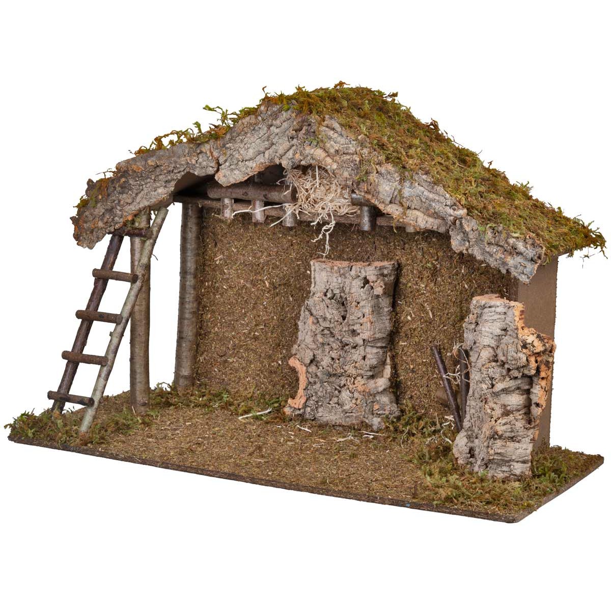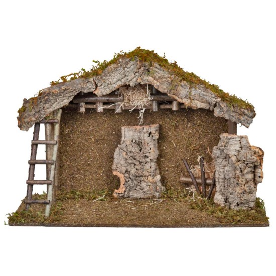 Capanna vuota per presepe perfetta per creare ambientazioni suggestive nel tuo presepe. La struttura si distingue per due grandi pezzi di corteccia, un piccolo soppalco in alto decorato con paglia e un recinto sottostante. Una grande scala a sinistra conduce al tetto spiovente, anch’esso realizzato in corteccia e ricoperto di muschio. Consigliata per Natività di altezza 30 cm, è realizzata da artigiani italiani con legno, sughero e muschio, materiali naturali che conferiscono autenticità e cura a ogni dettaglio.