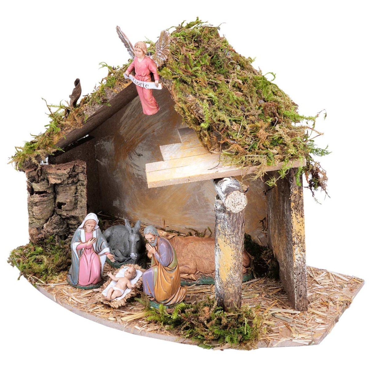 Capanna completa di Natività, con tettoia laterale sorretta da travi in legno, consigliata per statue da 10 cm.
