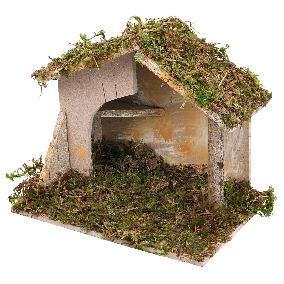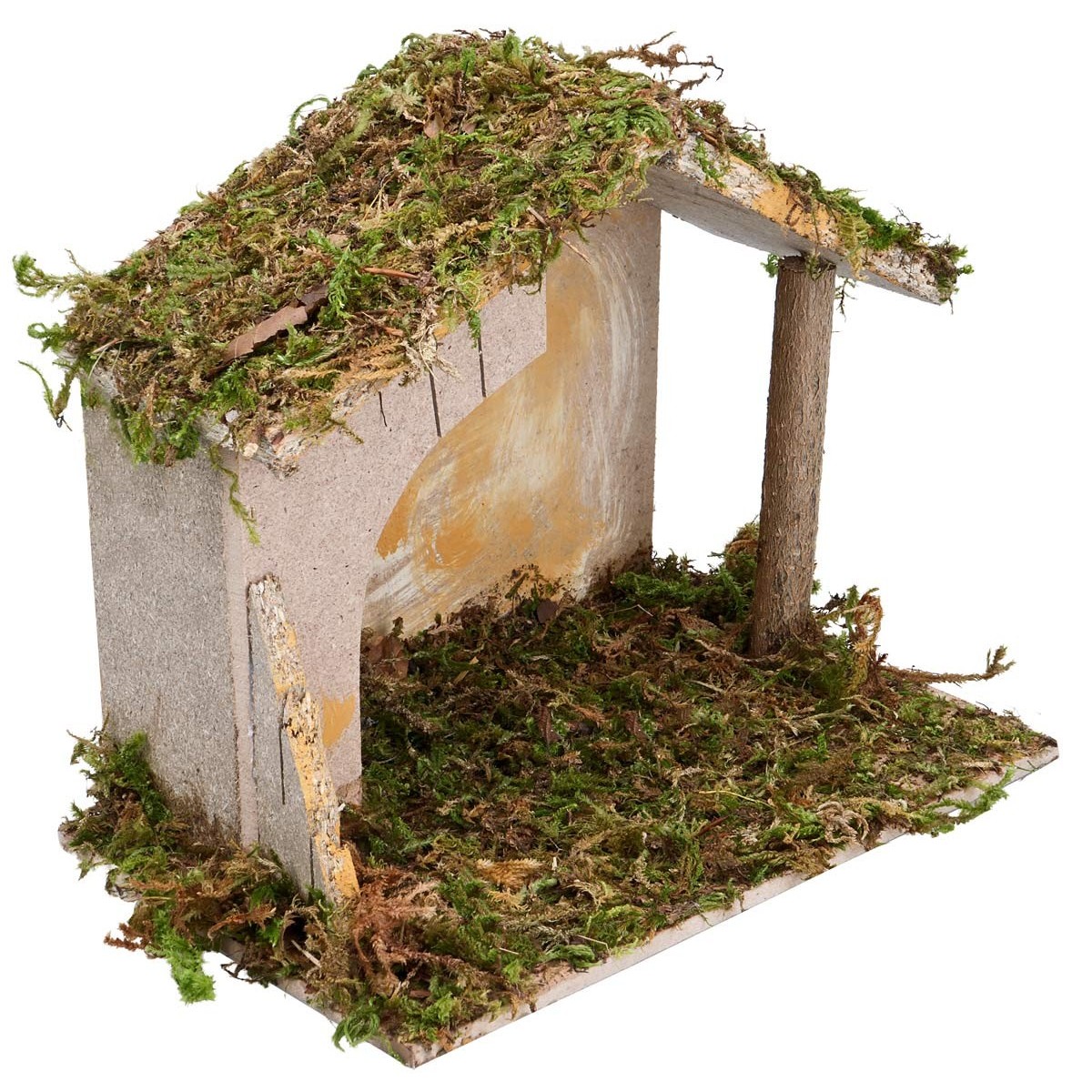 Il tetto è sorretto da un palo in legno e rifinito con muschio, mantenendo uno stile semplice e tradizionale adatto a presepi classici.
