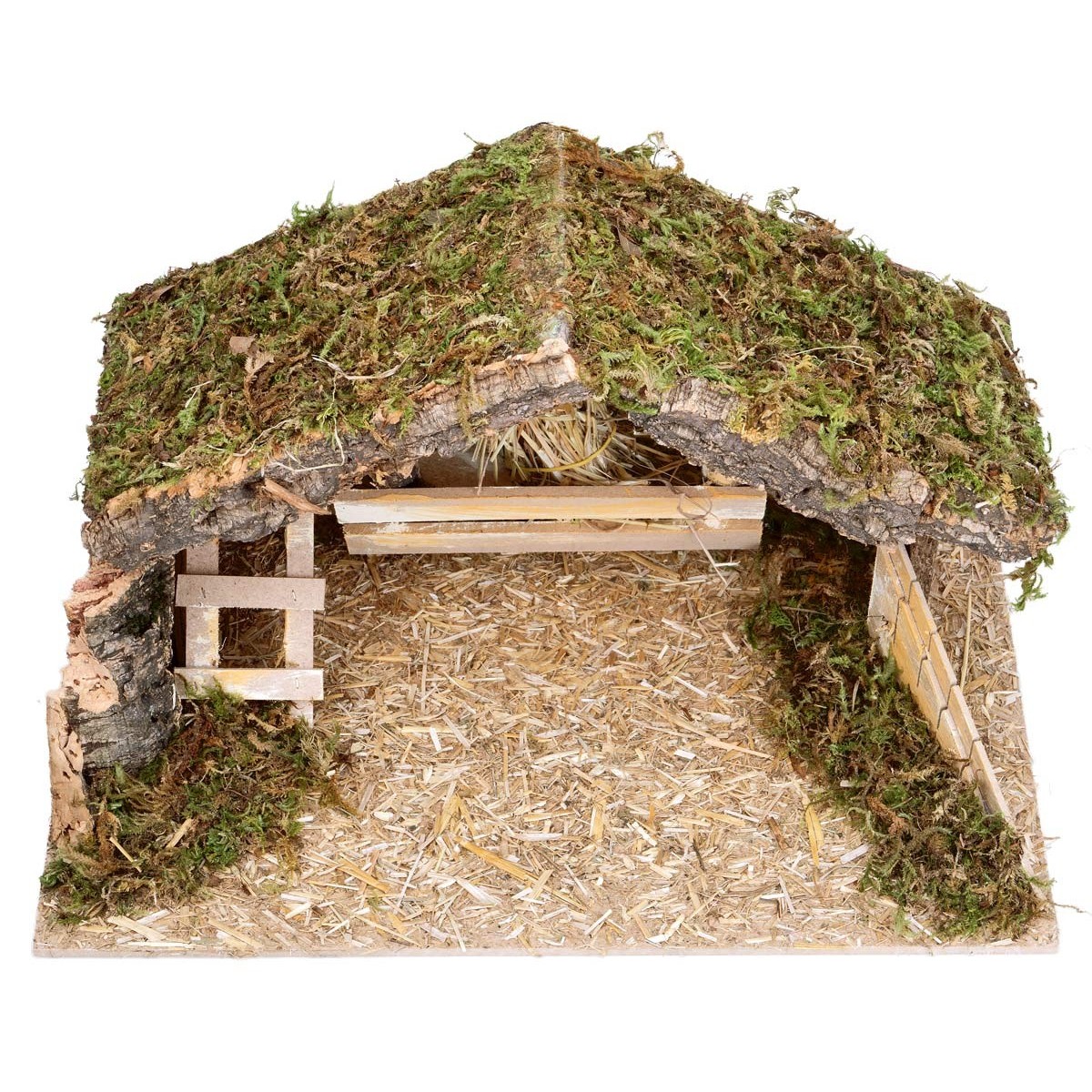 La struttura è aperta frontalmente e presenta una mangiatoia in legno posizionata al centro, riempita con paglia, ben visibile e adatta a ospitare la Natività.