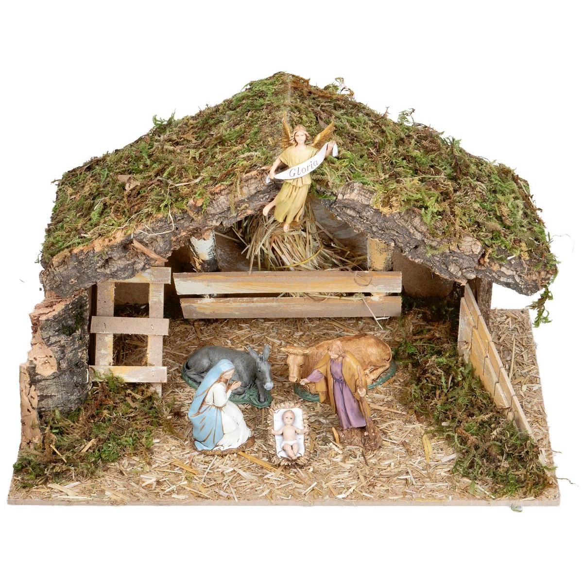 Capanna con tetto spiovente e mangiatoia centrale colma di paglia, completa di natività a 6 soggetti della serie Landi Moranduzzo 10 cm.