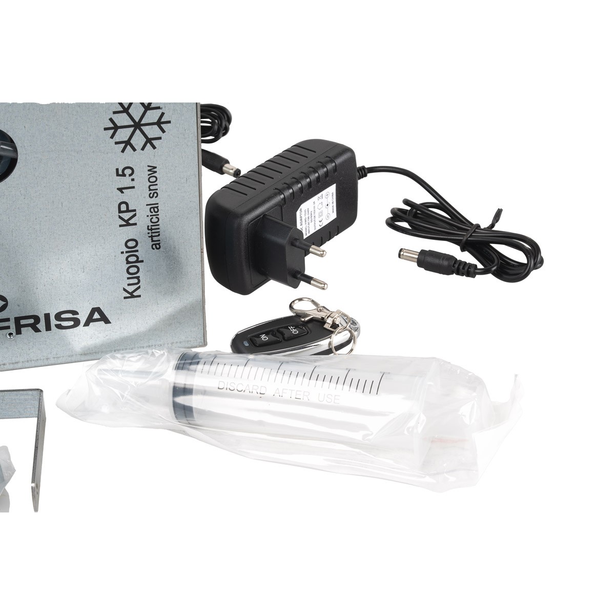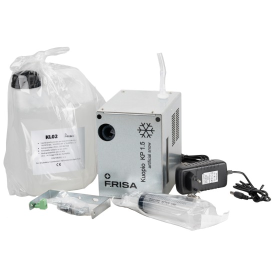 KP1.5 è una macchina per effetto neve compatta e leggera, progettata per emulare la qualità di nevicata dei modelli più grandi con un sistema di gestione migliorato. Può operare sia in modalità manuale che automatica, gestibile tramite accensione e spegnimento (START/STOP) con 12 volt DC, tramite contatto pulito, con il telecomando fornito o con un commutatore a intermittenza.