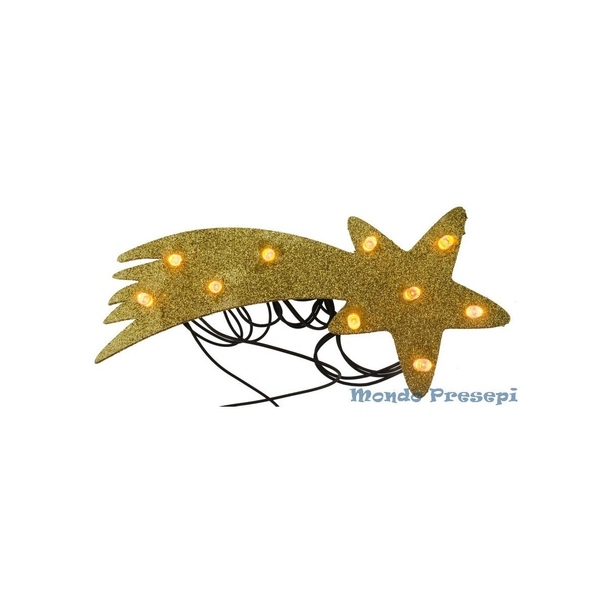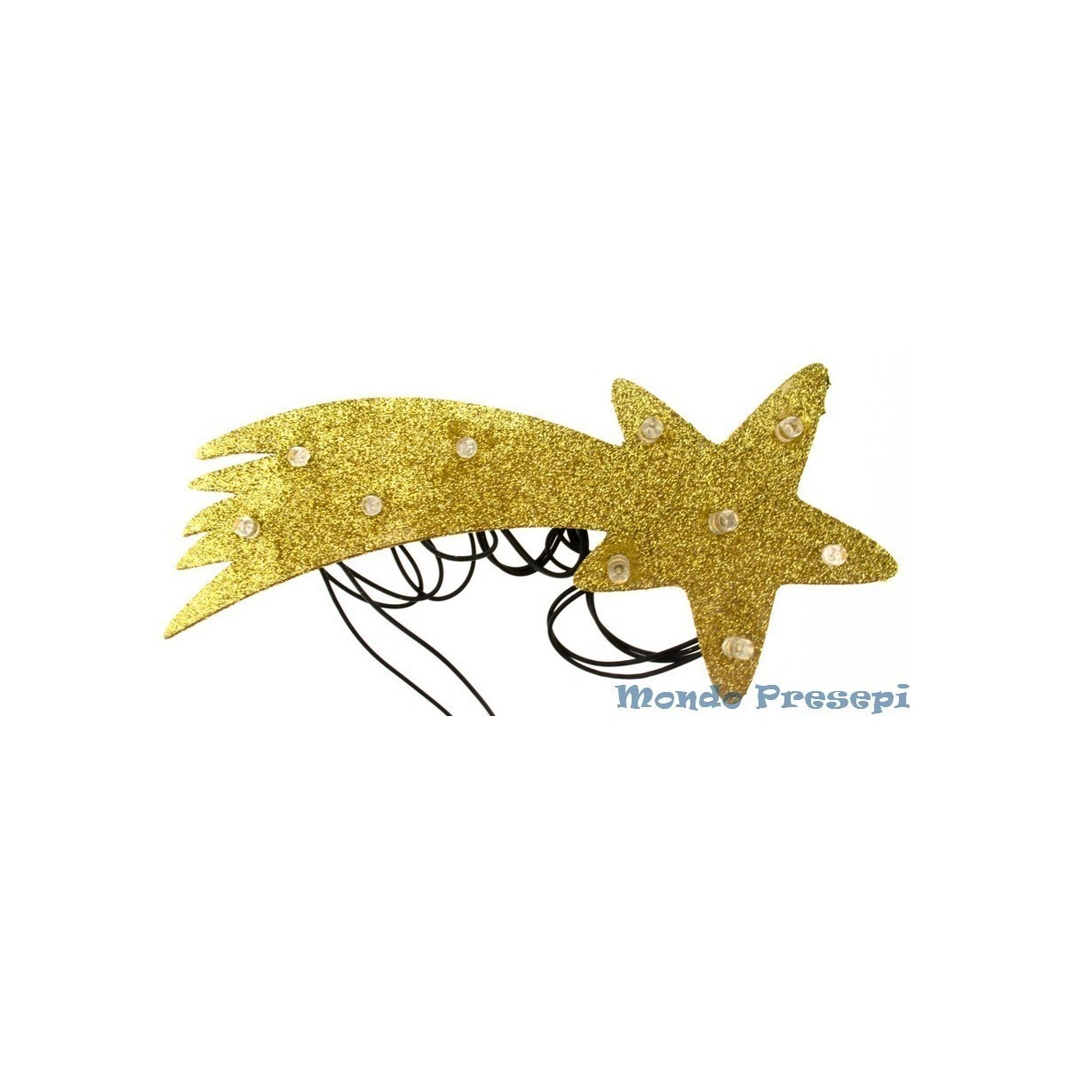 Stella cometa in legno, rivestita in glitter color oro con 10 led a luce classica, incluso il portapile dotato di pulsante on/off (funzionanti con 3 stilo non incluse)