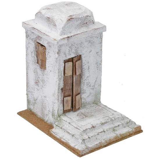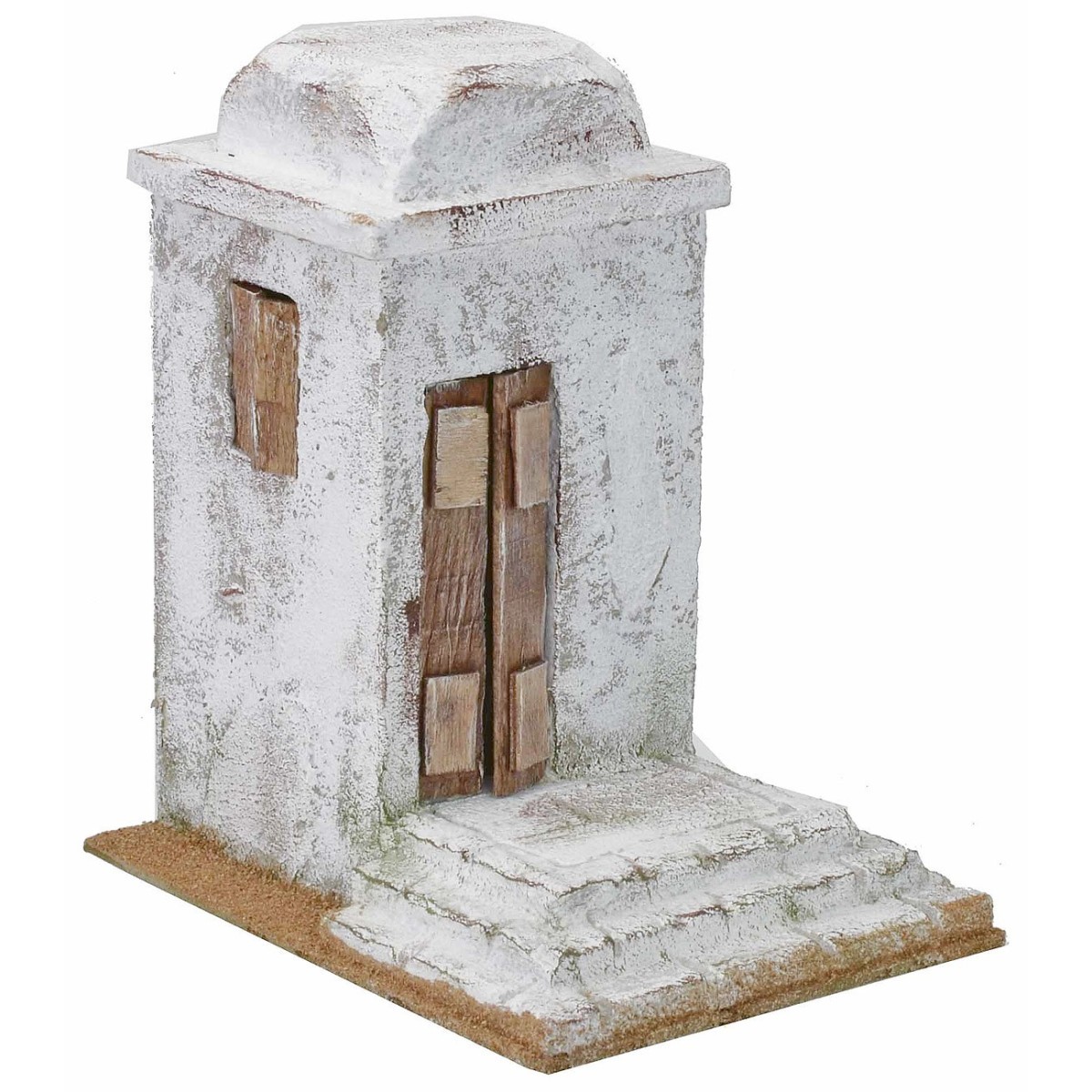 Casa palestinese singola con scalinata fronte alla porta semi aperta, sul lato destro una piccola finestra con ante socchiuse e sul tetto la caratteristica cupola. Questa ambientazione è stata creata da artigiani italiani per il Presepe palestinese in polistirene, consigliata per statue di altezza 8-10 cm.